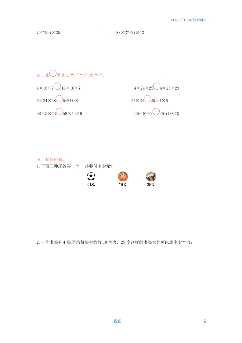http://t.cn/Ri466E4第六单元演练一、填空题。1.根据运算律在一里填上合适的数.48+62=+4828×16=×2867+58+33=-☐+☐)+588×4×25=8×(☐×☐)(28+25)×4×4+×42.如果用a和b分别表示两个数加法交换律可以表示为(),乘法交换律可以表示为(3.根据“aXb80”填空。若a不变,b除以10,则积是(方若b不变,a乘10,则积是(若a乘4,b除以4,则积是().二、判断题。(对的画“√”错的画“×”)、1.25×8×4×125=(25×4).+(125×8)=1100()2.2076+601=2076+6.00+1()3.(100+7)×53=100×53+7×53,这里运用了乘法分配律.()4.如果a2336=b4305,那么a>b.()5.aXb一定大于a+b.()三、计算题。1.直接写得数.125×8=18×4=144÷1225×2=.72÷2=320÷40=180÷30=38+6225+1752.用简便方法计算.748+39+61125×1625×64750+1014×8×25356+(67+44)数直