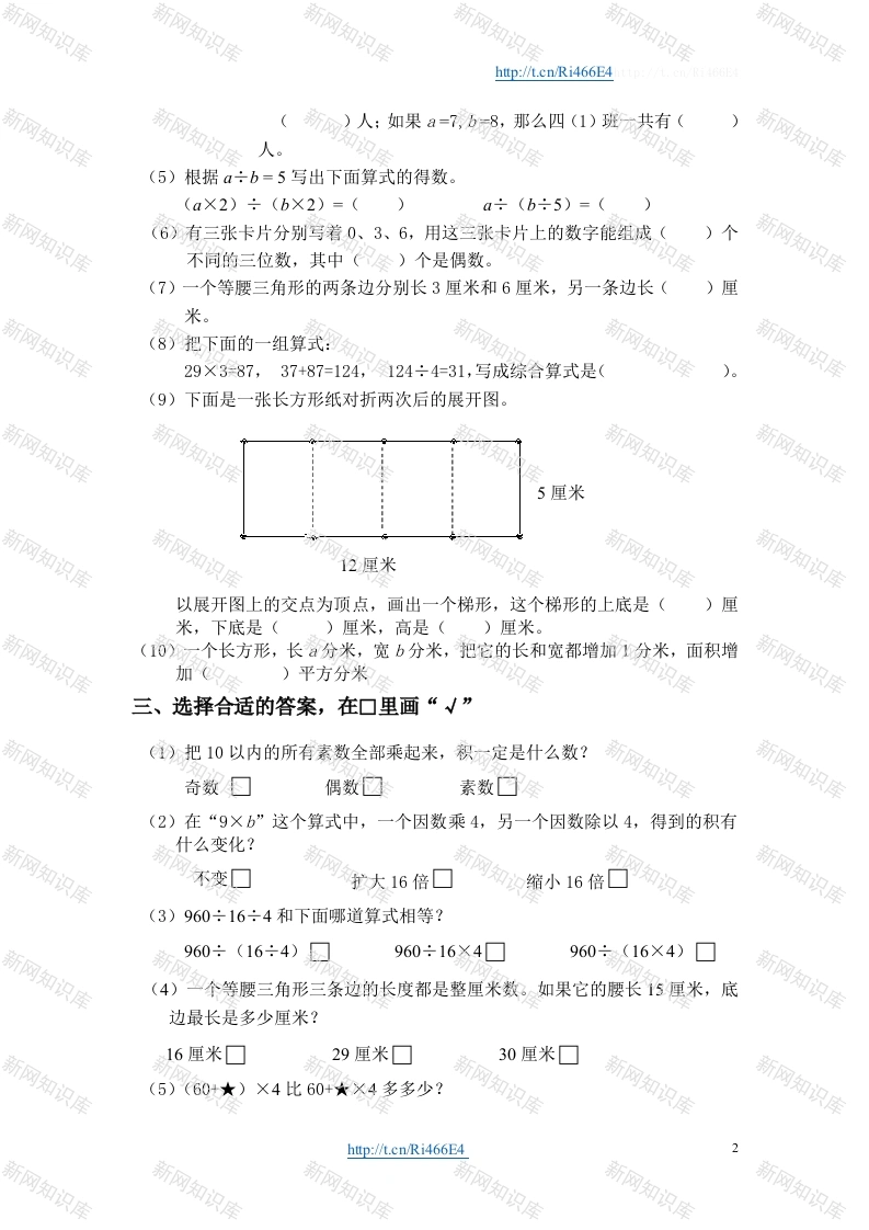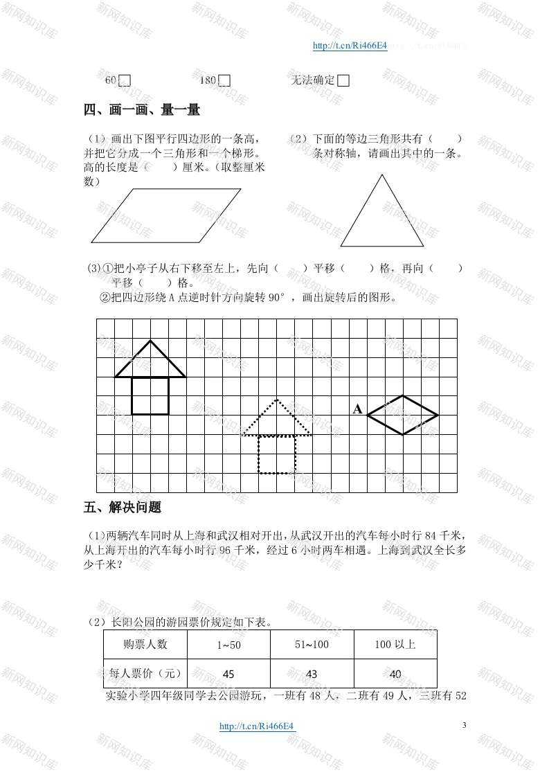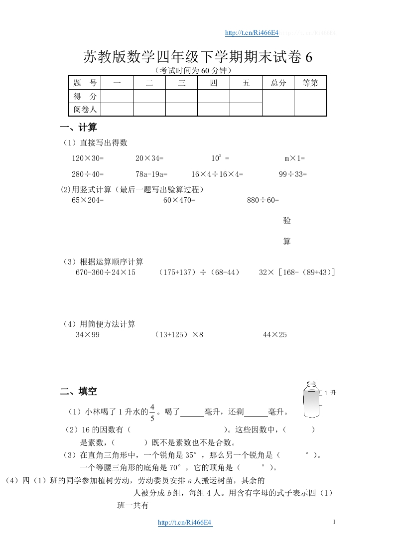 http://t.cn/Ri466E4苏教版数学四年级下学期期末试卷6(考试时间为60分钟)题号二三四五总分等第得分阅卷人一、计算(1)直接写出得数120X30=20×34=102=mX1=280÷40=78a-19a16×4÷16×4=99÷33=(2)用竖式计算(最后一题写出验算过程)65×204=60×470=880÷60=验算(3)根据运算顺序计算670-360÷24×15(175+137)÷(68-44)32×[168-(89+43)](4)用简便方法计算34×99(13+125)×844×25二、填空(1)小林喝了1升水的生。喝了毫升,还剩毫升。(2)16的因数有()。这些因数中,(是素数,()既不是素数也不是合数。(3)在直角三角形中,一个锐角是35°,那么另一个锐角是(。)一个等腰三角形的底角是70°,它的顶角是(。)。(4)四(1)班的同学参加植树劳动,劳动委员安排a人搬运树苗,其余的人被分成b组,每组4人。用含有字母的式子表示四(1)班一共有http://t.cn/Ri466E4