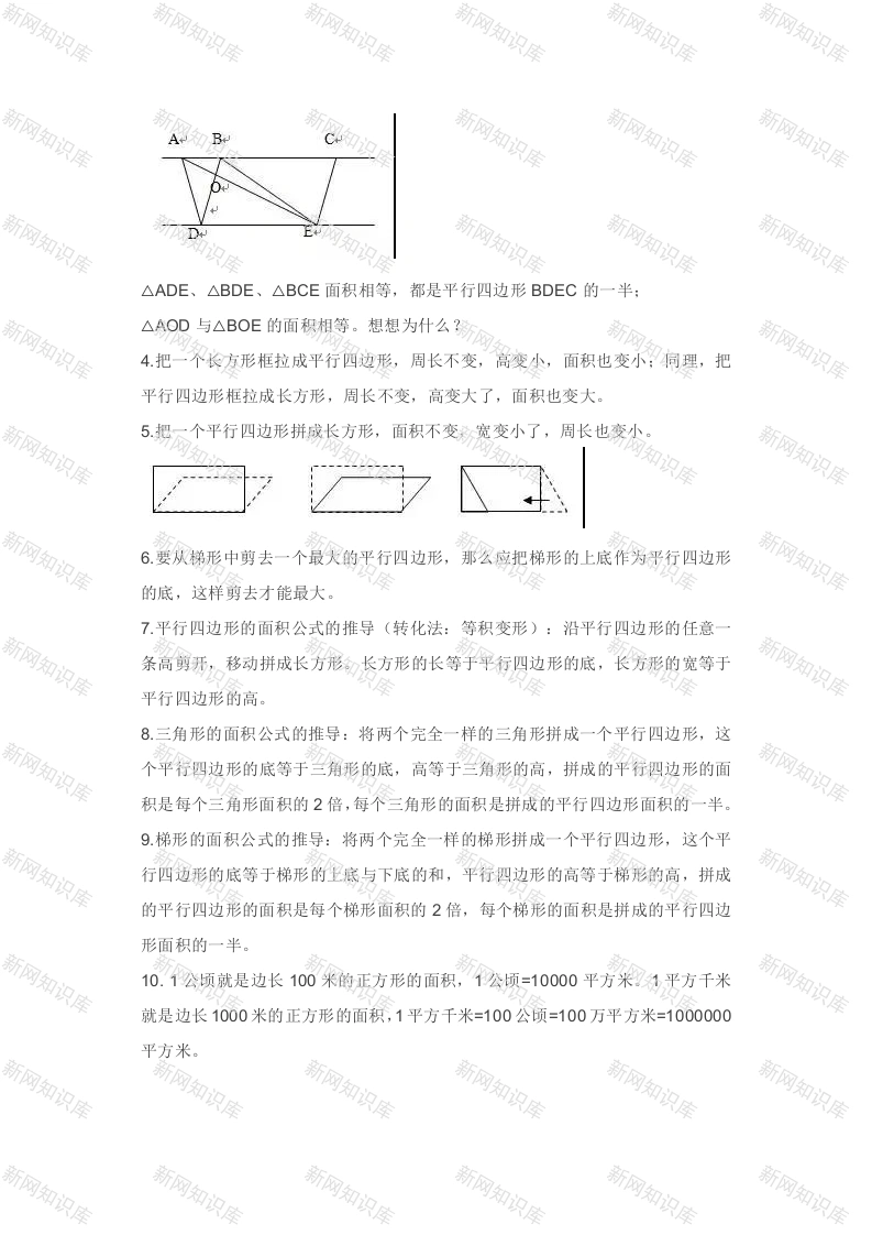 苏教版五年级上册知识点汇总第一章负数的初步认识1.0既不是正数,也不是负数。正数都大于0,负数都小于0。2.在数轴上,以“0”为分界点,越往左边的负数越小,左边的数都比右边的数小。3.在生活中,0作为正、负数的分界点,常常用来表示具有相反关系的量。如零上温度(+)、零下温度(一):海平面以上(+)、海平面以下(一):盈利(+)、亏损(一):收入(+)、支出(一):南(+)、北(一):上升(+)、下降(一)4.水沸腾时的温度是100℃,水结冰时的温度是0℃:-10℃比-5℃低5℃,6℃比-6℃高12℃。第二章多边形的面积1.一个平行四边形能分割成两个完全相同的三角形:两个完全相同的三角形能拼成一个平行四边形。2.一个平行四边形可以分割成两个完全相同的梯形:两个不同的梯形也可能拼成一个平行四边形。如图:完全相同的梯形不同的梯形知3.等底等高的平行四边形的面积相等,周长不等:等底等高的三角形的面积相等,周长不等:一个三角形的面积是与它等底等高的平行四边形面积的一半。如下图: