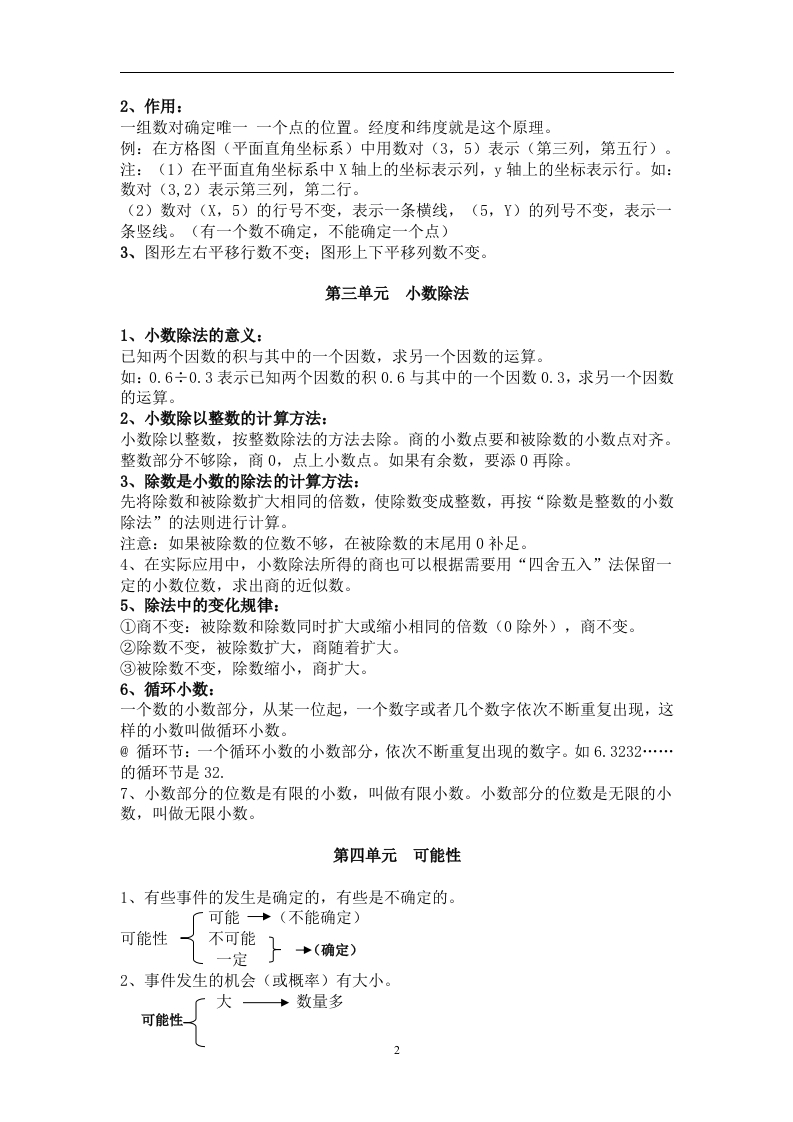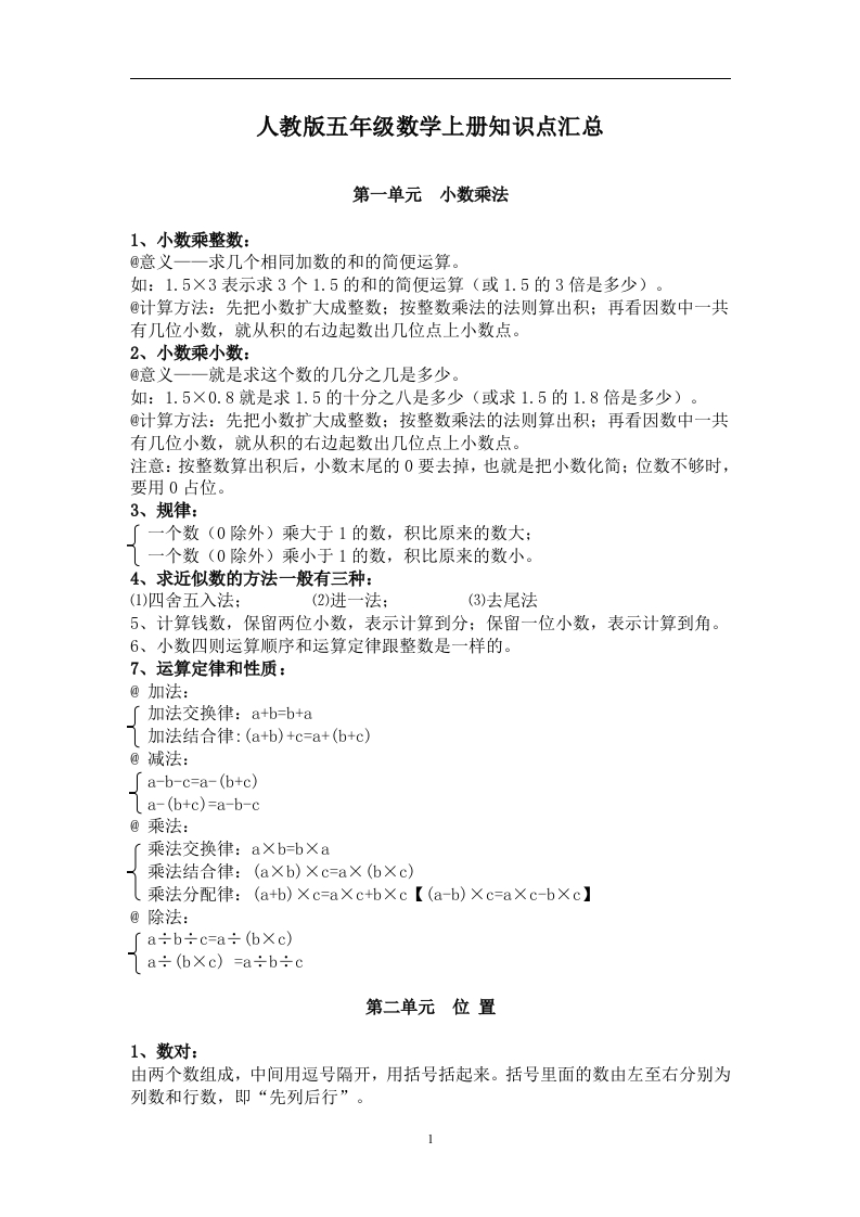 人教版五年级数学上册知识点汇总第一单元小数乘法1、小数乘整数:@意义一一求几个相同加数的和的简便运算。如:1.5×3表示求3个1.5的和的简便运算(或1.5的3倍是多少)。@计算方法:先把小数扩大成整数:按整数乘法的法则算出积:再看因数中一共有几位小数,就从积的右边起数出几位点上小数点。2、小数乘小数:@意义一一就是求这个数的几分之几是多少。如:1.5×0.8就是求1.5的十分之八是多少(或求1.5的1.8倍是多少)。@计算方法:先把小数扩大成整数:按整数乘法的法则算出积:再看因数中一共有几位小数,就从积的右边起数出几位点上小数点。注意:按整数算出积后,小数末尾的0要去掉,也就是把小数化简:位数不够时,要用0占位。3、规律:一个数(0除外)乘大于1的数,积比原来的数大:一个数(0除外)乘小于1的数,积比原来的数小。4、求近似数的方法一般有三种:(1)四舍五入法:(2)进一法:(3)去尾法5、计算钱数,保留两位小数,表示计算到分:保留一位小数,表示计算到角。6、小数四则运算顺序和运算定律跟整数是一样的。7、运算定律和性质:@加法:「加法交换律:a+b=b+a加法结合律:(a+b)+c=a+(b+c)@减法:[a-b-c=a-(b+c)a-(b+c)=a-b-c@乘法:乘法交换律:aXb=b×a乘法结合律:(aXb)Xc=aX(bXc)(乘法分配律:(a+b)×c=aXc+bXc【(a-b)Xc=aXc-bXc】@除法:[a÷b÷c=a÷(bXc)1a÷(bXc)=a÷b÷c第二单元位置1、数对:由两个数组成,中间用逗号隔开,用括号括起来。括号里面的数由左至右分别为列数和行数,即“先列后行”。