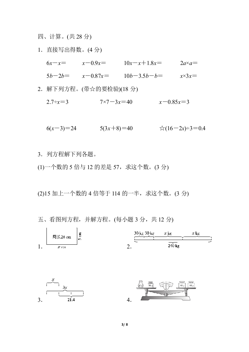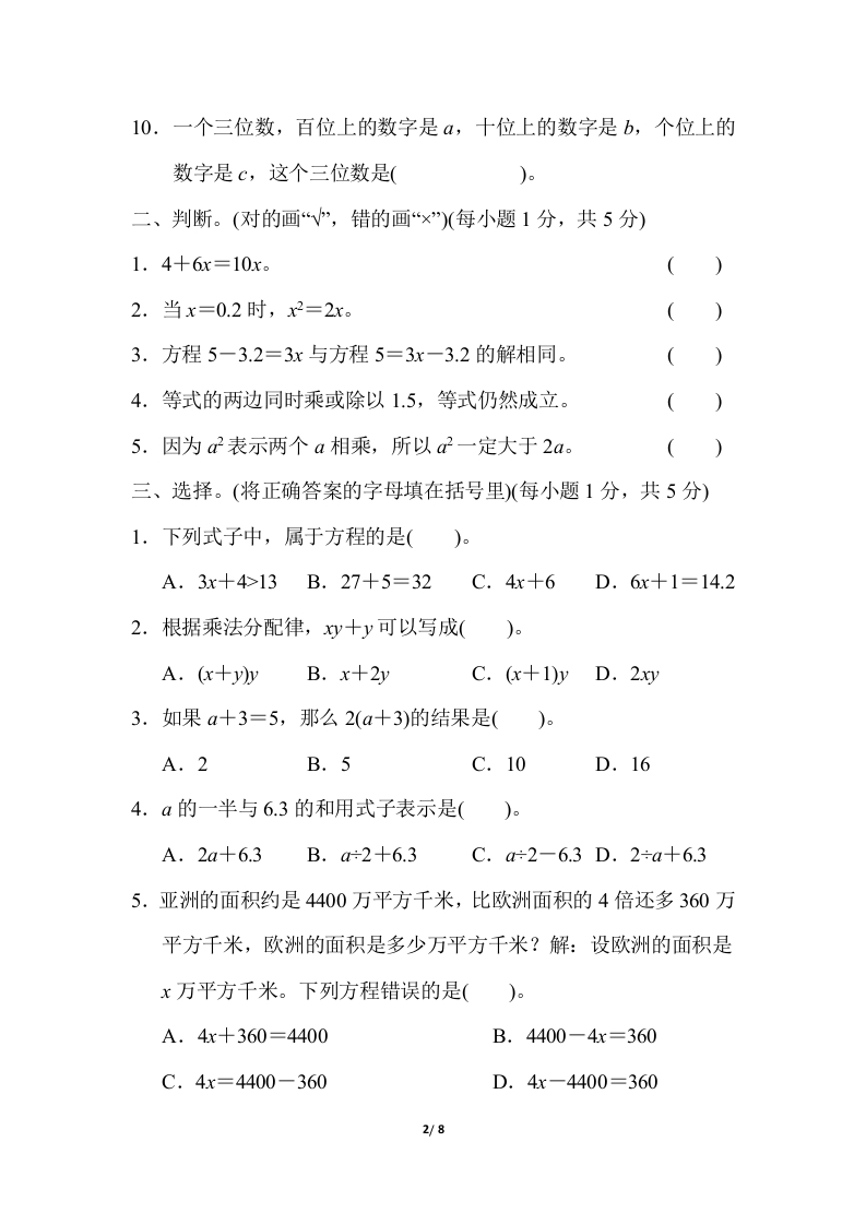 第五单元达标检则卷一、填空。(每空1分,共20分)1.甲数是7.8,比乙数多a,乙数是(),甲、乙两数的和是()。2.汽车每小时行xkm,5小时行()km,行100km需要(小时。3.ax(7+b),当a=5,b=()时才能使a×(7+b)=52.5。4.根据运算定律填空。a×7.5+7.5×b=7.5×()1.25×m×8=()×()×()5.当x=0.2时,x2+x=().若1.5x+3=4.5,则2x-0.9=(6.鸡有x只,鸭的只数是鸡的2.5倍,鸡和鸭一共有()只,鸭的只数比鸡多()只。7.将一根长xm的铁丝围成一个长am的长方形,长方形的宽是)m;若将这根铁丝围成一个正方形,正方形的边长是()m。8.修一条长am的公路,己经修了5天,平均每天修bm,余下的要用8天修完,(a-5b)8表示();如果a=2000,b=160,那么(a-5b)÷8=(9.甲数是a,若乙数比甲数的1.5倍少3.5,乙数是():若甲数比乙数的1.5倍少3.5,乙数是(1/8