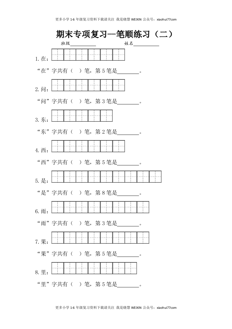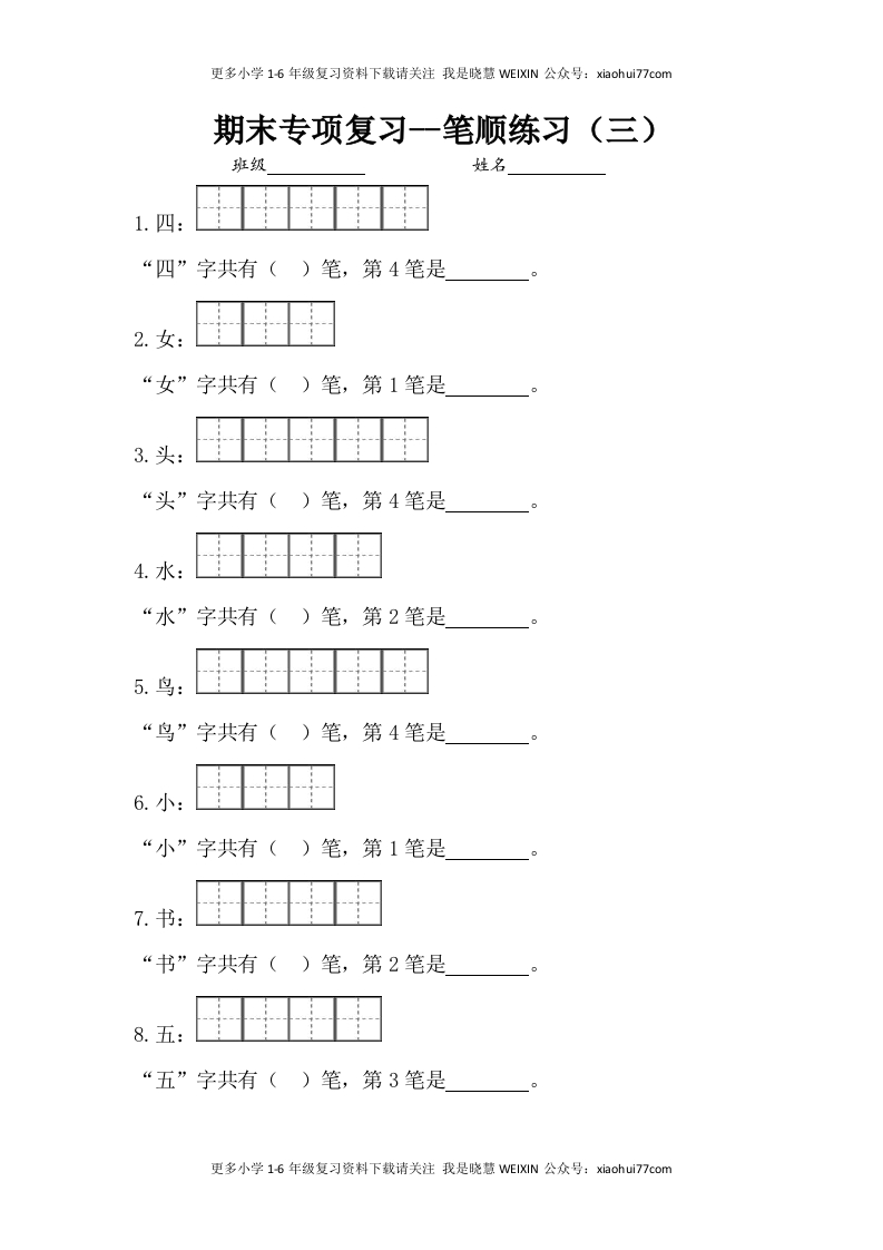 更多小学16年级复习资料下载请关注我是晓慧WEIXIN公众号:xiaohui77com期末专项复习一笔顺练习(一)班级姓名1.云:“云”字共有()笔,第3笔是2.上:“上”字共有()笔,第2笔是3.口:“口”字共有()笔,第2笔是4.目:“目”字共有()笔,第2笔是5.耳:“耳”字共有()笔,第6笔是6.手:“手”字共有()笔,第4笔是7、心:“心”字共有()笔,第2笔是8.我:“我”字共有()笔,第5笔是更多小学16年级复习资料下载请关注我是晓慧WEIXIN公众号:xiaohui77com