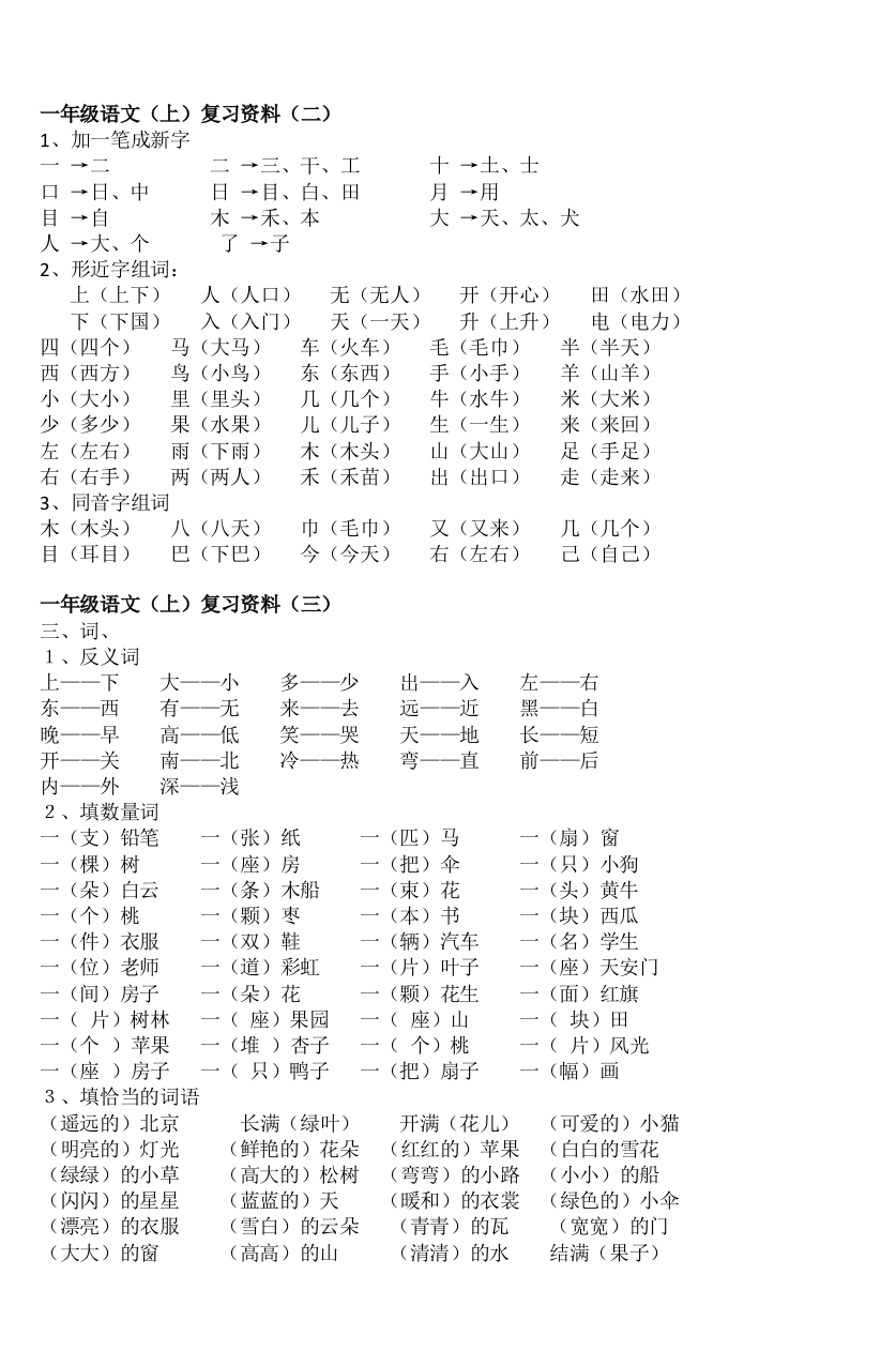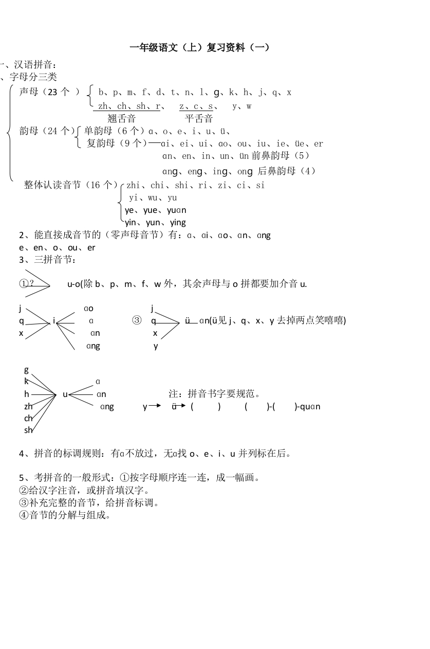 一年级语文(上)复习资料(一)·、汉语拼音:字母分三类声母(23个)b、p、m、f、d、t、n、1、g、k、h、j、q、xzh、ch、sh、r、Z、C、s、y、w翘舌音平舌音韵母(24个)「单韵母(6个)a、0、e、i、u、i、复韵母(9个)一ai、ei、ui、ao、ou、iu、ie、ie、eran、en、in、un、in前鼻韵母(5)ang、eng、ing、ong后鼻韵母(4)整体认读音节(16个)(zhi、chi、shi、ri、zi、ci、siyi、Wu、yuye、yue、yuanyin、yun、ying2、能直接成音节的(零声母音节)有:a、ai、ao、an、ange、en、o、ou、er3、三拼音节:12uo(除b、p、m、f、w外,其余声母与o拼都要加介音u.ao③ⅱ_an(d见j、q、x、y去掉两点笑嘻嘻)anXanghan注:拼音书字要规范。zhangy+i+()((quanchsh4、拼音的标调规则:有a不放过,无a找o、e、i、u并列标在后。5、考拼音的一般形式:①按字母顺序连一连,成一幅画。②给汉字注音,或拼音填汉字。③补充完整的音节,给拼音标调。④音节的分解与组成。