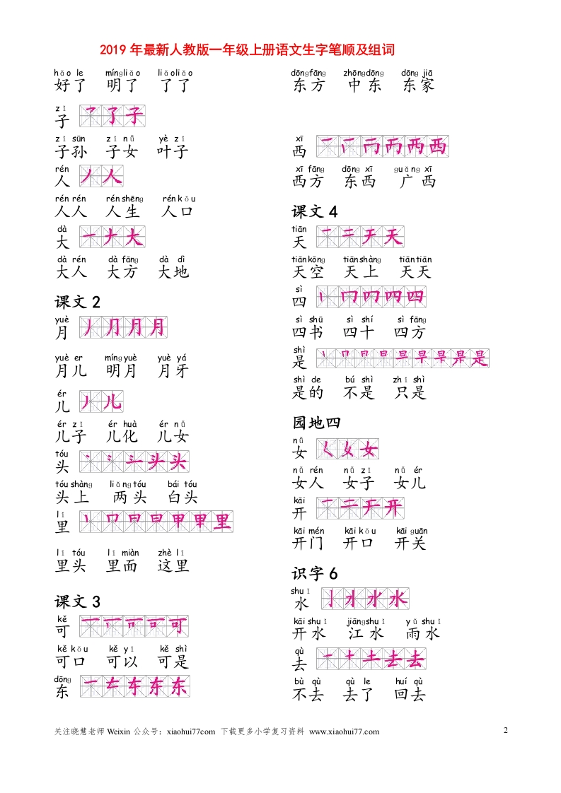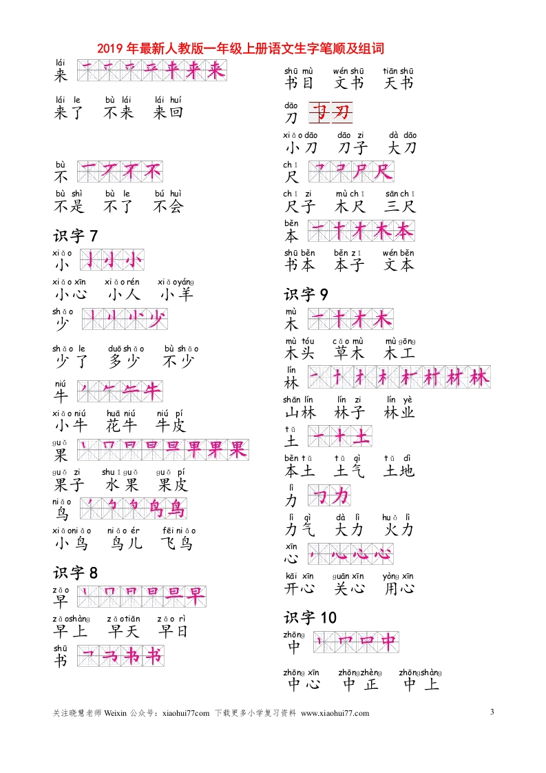 2019年最新人教版一年级上册语文生字笔顺及组词识字2“平tian田尺用用”米”完yi xicàshu I tidntian dida tiar一下水田田地大田二半禾禾手半he midohe zihe tian禾苗禾子禾田名san tiansanren兴米火火三天三人dàhuahuǚmidohu o shan大火火苗火山识字3chosha虫P中虫虫上chong zifei chongji a chongshang toutian shangshang xia虫子飞虫甲虫上头天上上下kou罢去口bai yunchukǒuyun du&yun yakǚucdguankou云朵云雨出口口才关口白云用月耳shan冒山出xiàmu guangmùdidàshanshanshangshanzhong目下目光目的大山山上山中耳开开开耳园地一色rduiEr mumu er耳朵耳目木耳水sh手”手ba geba tianba fang八个八天八方ren sh ouXiǎoshǒushǒuqi人手小手手气米十识字5平背平光shi nian十年日日课文1ri zisheng riri yue日子生日日月片了关注晓慧老师Weixin公众号:xiaohui77com下载更多小学复习资料www.xiaohui77.com1