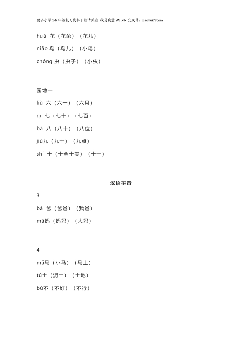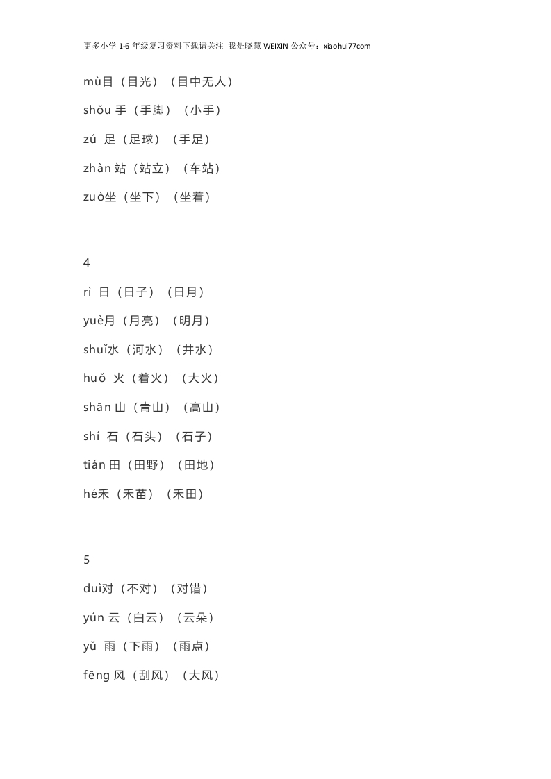 更多小学16年级复习资料下载请关注我是晓慧WEIXIN公众号:xiaohui77com一(上)识字表生字组词带拼音1tian天(蓝天)(天空)d地(大地)(地球)rén人(人们)(人民)ni你(你们)(你的)wǒ我(我们)(我的)ta他(他们)(他的)2yi一(一个)(一人)èr二(二十)(十二)san三(三十)(三月)sì四(四十)(十四)wǔ五(十五)(五颜六色)shang上(上下)(上山)ià下(下班)(下去)3kǒu口(口水)(口罩)ěr耳(耳朵)(肥头大耳)》