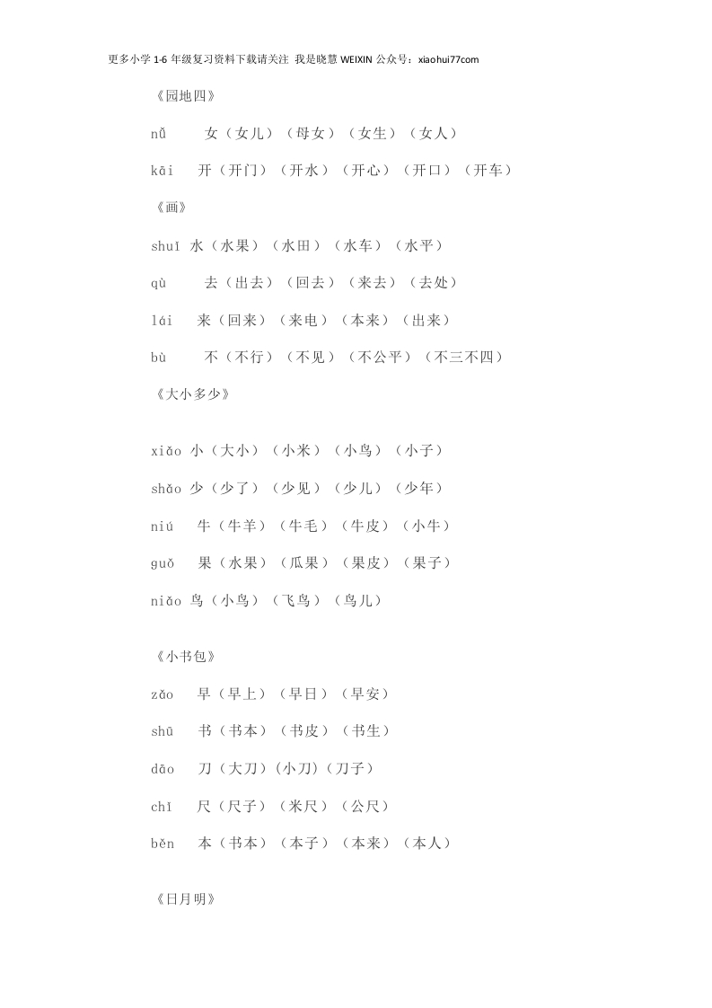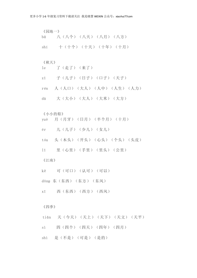 更多小学16年级复习资料下载请关注我是晓慧WEIXIN公众号:xiaohui77com一(上)写字表生字组词《金木水火土》yi一(一个)(一人)(一只)èr二(二手)(二月)(二人)san三(三天)(三个)(三年)shang上(上下)(上车)(上山)(上来)《口耳目》kǒu口(人口)(出口)(门口)(开口)(口水)mù目(头目)(耳目)(目中无人)(书目)ěr耳(木耳)(耳目)(耳朵)(中耳)shǒu手(手巾)(手电)(手心)(手足)《日月水火》ri日(日子)(日月)(今日)(日本)tian田(水田)(田里)(田地)he禾(禾田)(禾苗)huǒ火(火车)(上火)(水火)(生火)(大火)《对韵歌》ch6ng虫(飞虫)(虫子)(虫牙)yun云(白云)(鸟云)(一片云)shan山(大山)(山羊)(上山)(下山)(火山)