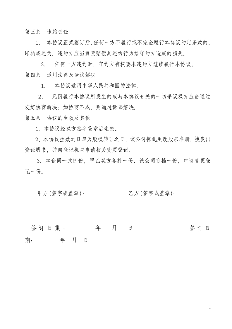 转股协议参考样本之:股东内部转让股权公司股权转让协议甲乙双方根据《中华人民共和国公司法》等法律、法规和公司(以下简称该公司)章程的规定,经友好协商,本着平等互利、诚实信用的原则,签订本股权转让协议,以资双方共同遵守。甲方(转让方):乙方(受让方):住所:住所:第一条股权的转让1、甲方将其持有该公司%的股权转让给乙方;2、乙方同意接受上述转让的股权:3、甲乙双方确定的转让价格为人民币万元;4、甲方保证向乙方转让的股权不存在第三人的请求权,没有设置任何质押,未涉及任何争议及诉讼。5、甲方向乙方转让的股权中尚未实际缴纳出资的部分,转让后,由乙方继续履行这部分股权的出资义务。(注:若本次转让的股权系已缴纳出资的部分,则删去第5款)6、本次股权转让完成后,乙方即享受%的股东权利并承担义务。甲方不再享受相应的股东权利和承担义务。7、甲方应对该公司及乙方办理相关审批、变更登记等法律手续提供必要协作与配合。第二条转让款的支付(注:转让款的支付时间、支付方式由转让双方自行约定并载明于此)1