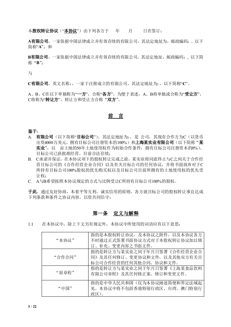 4.股权转让合同模板xmtt885个月前发布关注私信81.32KB22页03814 第1页 / 共22页 第2页 / 共22页 第3页 / 共22页 试读已结束,还剩19页,您可下载完整版后进行离线阅读 4.股权转让合同模板此内容为付费资源,请付费后查看¥1¥2会员服务免费立即购买您当前未登录!建议登陆后购买,可保存购买订单付费资源© 版权声明文章版权归作者所有,未经允许请勿转载。THE END创业合伙协议 文本预览 日期:A有限公司、B有限公司与C有限公司关于上海某食品饮料有限公司之股权转让协议 查看更多 收起部分 喜欢就支持一下吧点赞14 分享QQ空间微博QQ好友海报分享复制链接收藏