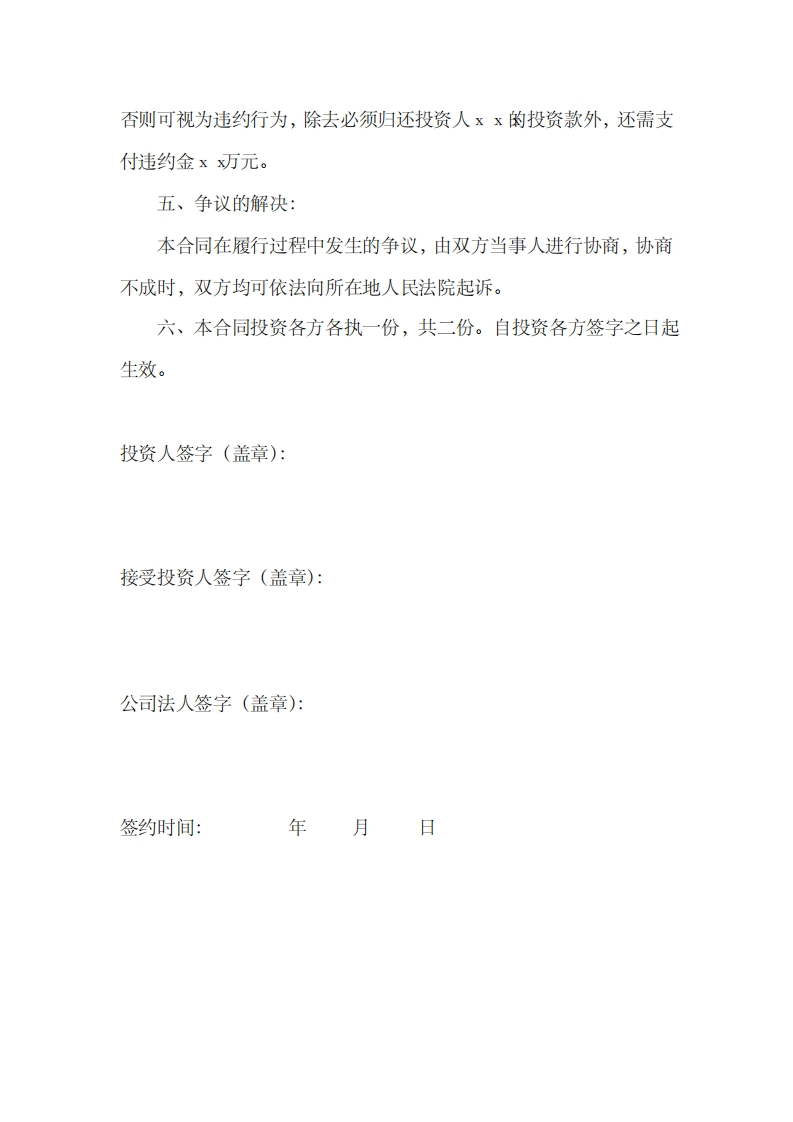 个人投资入股协议书投资各方根据《中华人民共和国公司法》和其他有关法律法规,根据平等互利的原则,投资各方经过友好协商,就xx投资xxx有限公司事宜,达成一致,签订本协议:一、本合同的投资方为:y身份证:,住址:二、公司的信息:、公司地址:一-一一、2公司的法定代表人为:xx。x、3公司是依照《公司法》和其他有关规定成立的有限公司。投资各方以各自认缴的出资额为限对公司的债权债务承担责任。各方按其出资比例分享利润,分担风险及亏损。4、投资人xx自投资之日起分享权益、利润,xx有限公司在xx投资之前的债权、债务一概与xx无关。(以投资之日起的会计报表为准)。三、投资方的出资方式和出资额投资人:xx的出资额为(人民币)x万元,占投资总额的xx。%四、违约责任:1、接受投资方即xxx有限公司,在办理相关手续结束前(以营业执照更换为准),不得动用xx注入公司账户的xx万元验资款项,
