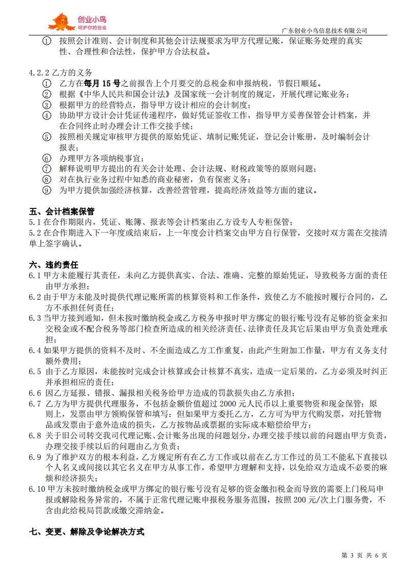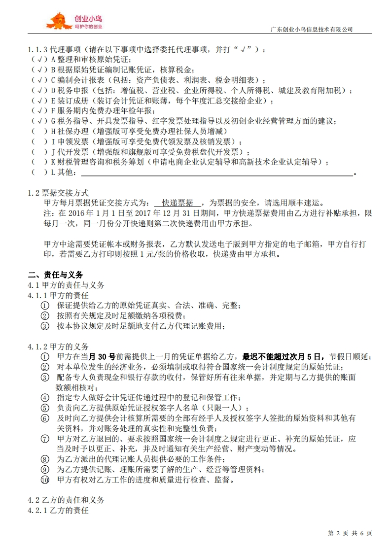创业小鸟呵护你的创业广东创业小鸟信息技术有限公司创业小鸟代理记账服务协议合同编号:CYXN2016032315被代理方(甲方):代理方(乙方):广东创业小鸟信息技术有限公司法人代表:法人代表:陈荣峰联系电话:联系电话:0757-8222156182228584联系地址:联系地址:广东省佛山市禅城区三友南路17号泛家居电商创意园1号楼103-104依据《中华人民共和国合同法》、《中华人民共和国会计法》及其它相关的法律法规的规定,甲方因经营管理需要,委托乙方代理记账,为了维护当事人的合法权益,双方本着诚信、平等、互利的原则,经双方代表协商达成如下协议:一、服务范围1.1代理期限、收费标准和代理事项1.1.1甲方委托乙方进行代理记账业务,选择服务版本为,时间为年,从年月日到年月日止,价格为¥大写:万仟佰拾元整,不含缴纳印花税和税局代开发票税点等费用。1.1.2收费标准如下:创业小鸟广东区域代理记账收费标准(价格单位为元)服务创业版标准版增强版旗舰版价格1200元/年2400元/1年3600元/年6000元/年3600元/2年类型0收入0申报3年以内小微企业3年以上小微企业发展型中小企业记账类别小规模纳税人小规模纳税人小规模纳税人一般纳税人会计核算税务申报√√出具财务报表√√先行赔付√风险提示√√√√一对一专人服务-√√√提供咨询方式邮件/QQ/微信邮件/QQ/微信电话/邮件/QQ/微信电话/邮件/QQ/微信税务筹划√银行开户400免费免费免费国税报到200免费免费免费地税报到200免费免费免费社保开户200免费免费免费社保增减员20元/人/次50元/3人/次免费免费购买发票/核销发票200元/次200元/次免费,不限次数免费,不限次数代开发票税盘代开50/次税盘代开50/次免费,开票金额50万免费,开票金额100税局代开200/次税局代开200/次/月以内万/月以内温馨提示:2015年后新开企业或从未开票企业需要开票请提前30个工作日申请购买税盘和发票,以免耽误您使用发票。第1页共6页