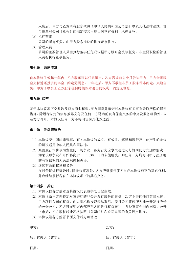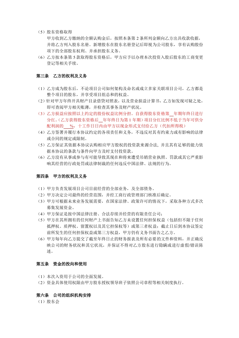 投资入股协议书本投资入股协议书(以下简称“本协议”)由以下各方签订:甲方:法定代表人:(以下简称为“甲方”)乙方:法定代表人:(以下简称为“乙方”)。鉴于:甲方因企业发展,针对“”项目公司拟进行股权优化,并同意乙方向甲方入注资本。甲方原股东同意对其股权进行调整,并且确认放弃对新增股东所认缴出资股份的认购优先权。为此,本着平等互利的原则,经过友好协商,各方就公司入资事宜达成如下协议条款:第一条定义和解释(1)定义除非本协议另有定义,否则本协议所述术语具有其在合同法中所述的含义。(2)标题各条款的标题仅为方便查阅之用,不影响本协议的解释。(3)提及本协议中提及中国的法律时应包括届时有效的中国的任何法律、法规、部门规章、最高人民法院的司法解释和中国有关机关(包括中央机关和地方机关)发布的规范性文件。提及法律时应解释为对那些分别经不时修订或变更的规定的提及。对本协议的提及应解释为包括可能经修订、变更或更新之后的有关协议。第二条新增股东(1)甲方原股东决议,决定吸收乙方参股经营且经乙方同意,由乙方持有“”项目公司%的股权。(2)经甲乙双方审计评估确认的现有净资产为依据,协商确定本条第1款中确定的股权认购价为人民币万元。(3)出资时间乙方应在本协议签定之日起个工作日内,将本协议约定的认购总价一次性足额存入甲方指定的银行帐户。逾期60工作日后,甲方有权单方面解除本协议。(4)甲方指定收款账户信息:账户名:开户行:账号: