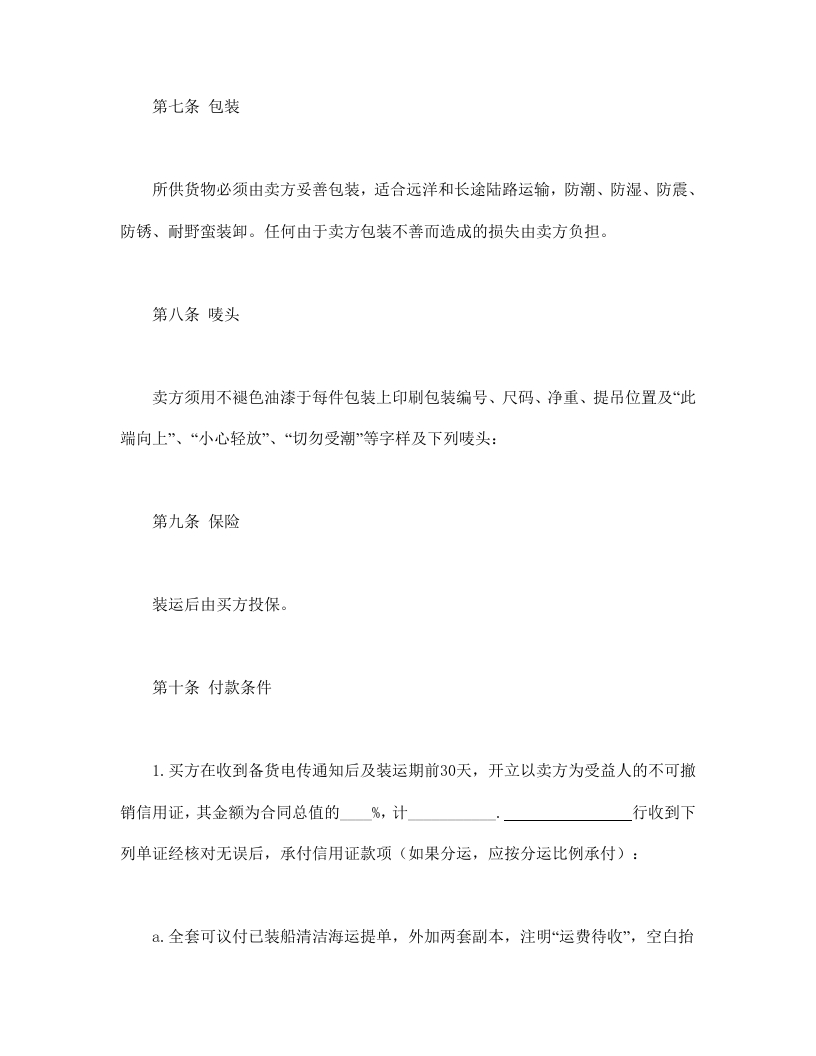 中外货物买卖合同2xmtt885个月前发布关注私信37.50KB11页0499 第1页 / 共11页 第2页 / 共11页 第3页 / 共11页 试读已结束,还剩8页,您可下载完整版后进行离线阅读 中外货物买卖合同2此内容为付费资源,请付费后查看¥1¥2会员服务免费立即购买您当前未登录!建议登陆后购买,可保存购买订单付费资源© 版权声明文章版权归作者所有,未经允许请勿转载。THE END购销合同 文本预览 中外货物买卖合同(F0B条款)买方:地址:邮编:电话:法定代表人:职务:卖方:地址:邮编:电话:法定代表人:职务:买卖双方遵循平等、自愿、互利、互惠原则协商并达成如下协议,共同信守。第一条品名、规格、数量及单位 查看更多 收起部分 喜欢就支持一下吧点赞9 分享QQ空间微博QQ好友海报分享复制链接收藏