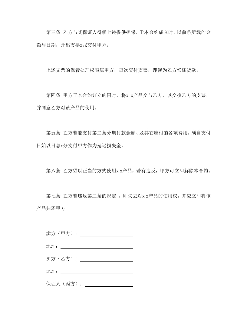 动产货品分期付款买卖契约书xmtt885个月前发布关注私信21KB3页0315 第1页 / 共3页 第2页 / 共3页 第3页 / 共3页 已完成全部阅读,共3页 动产货品分期付款买卖契约书此内容为付费资源,请付费后查看¥1¥2会员服务免费立即购买您当前未登录!建议登陆后购买,可保存购买订单付费资源© 版权声明文章版权归作者所有,未经允许请勿转载。THE END购销合同 文本预览 动产货品分期付款买卖契约书卖方:(以下简称甲方)买方:(以下简称乙方)保证人:(以下简称丙方)今甲方(卖方兼所有人)与乙方(买方兼使用者)就产品分期买卖事宜,订立合约如下:第一条本合约的标的物xx产品分期付款总额定为人民币xx元整。乙方得依照下列规定支付款项予甲方。(1)前款元(2)余款元(3)月息元。第二条乙方预付元予甲方,余款自年月日至年月日止,每月日前各支付元 查看更多 收起部分 喜欢就支持一下吧点赞5 分享QQ空间微博QQ好友海报分享复制链接收藏