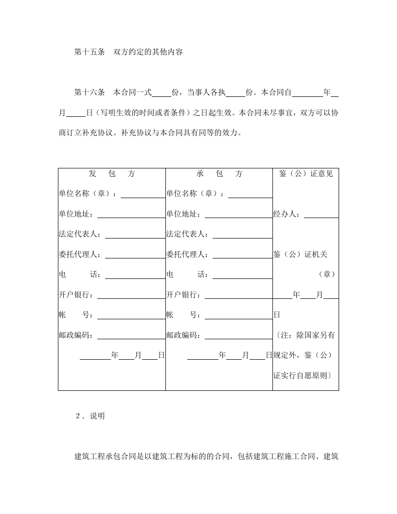 建筑工程承包合同1,格式建筑工程承包合同甲方:(写明名称、法定代表人和住所)(发包方)乙方:(写明名称、法定代表人和住所)(承包方)甲乙双方按照《中华人民共和国经济合同法》和《建筑工程承包合同条例》规定的原则,结合工程的实际情况,达成如下协议。第一条承包工程概况(包括工程名称、地点、内容、承包的范围、开工和竣工日期、质量等级等内容)第二条合同文件使用的语言文字、标准和适用的法律(本条主要是用于涉外方面的)第三条图纸(写明图纸提供的日期、套数、保密要求以及图纸的解释等)第四条甲乙双方驻工地代表(写明姓名、性别、年龄、在单位中的职务)