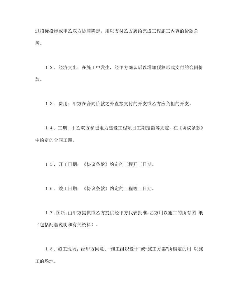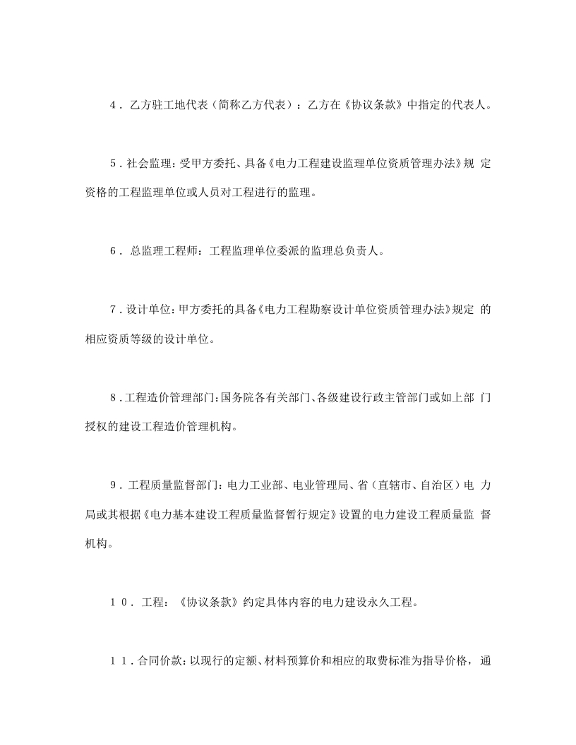 建设工程施工合同(电力2)电力建设工程施工合同条件第一章词语涵义及合同文件第一条词语涵义《电力建设工程施工合同》文本,由《电力建设工程施工合同条件》(以下简称《合同条件》和《电力建设工程施工合同协议条款》(以下简称《协议条款》)组成,其用词用语除《协议条款》另有约定外,应具有本条所赋予的涵义:1,发包方(简称甲方);《协议条款》约定的具有工程发包主体资格和支付工程价款能力的当事人。2,甲方驻工地代表(简称甲方代表:甲方在《协议条款》中指定的代表人。3,承包方(简称乙方):《协议条款》约定的、具有《电力施工企业资质管理办法》规定的工程承包主体资格并被发包方接受的当事人。