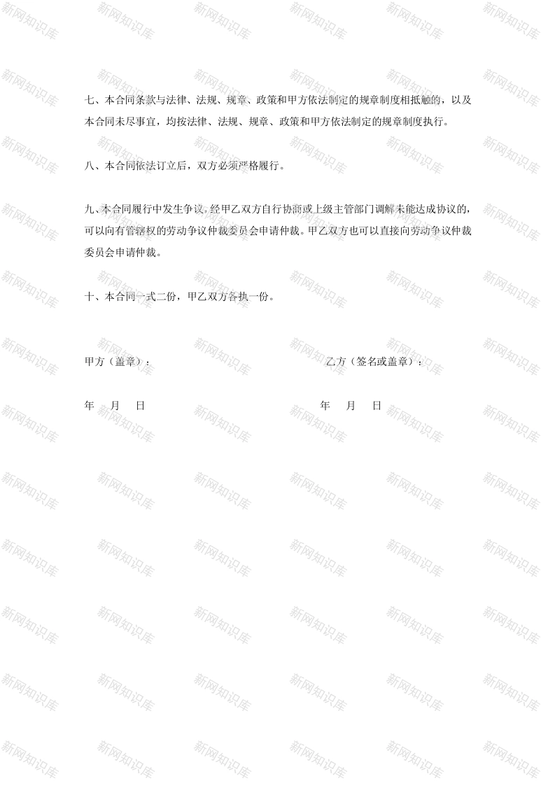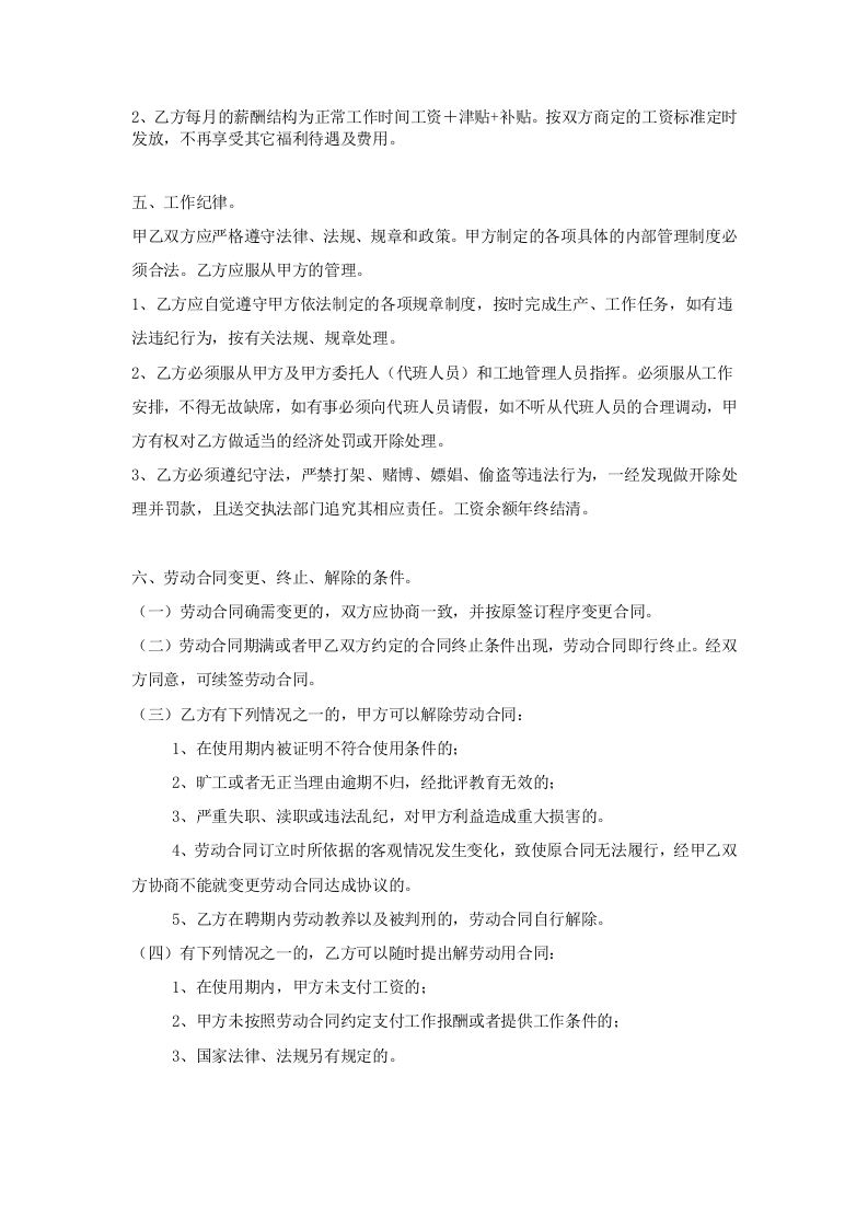 建筑工地用工劳动合同甲方(使用部门)名称:华发山庄桩基础工程(Ⅱ标)乙方(受聘人员)姓名:性别:民族:出生年月:身份证号:住址:联系电话:根据《中华人民共和国劳动法》以及有关法律、法规和政策的规定,经双方平等协商,订立本劳动合同。一、合同期限从年月日起至年月日止。甲方所负责施工的桩基础工程施工完成时止。二、工作内容1、乙方同意按甲方工作需要安排建筑施工有关的工作。在劳动合同期内,甲方可根据工作需要和乙方工作能力,变动乙方的工作内容、岗位。2、乙方同意遵守甲方依法制定的管理制度,按照甲方的要求,按时完成规定的工作数量并达到规定的质量标准。三、劳动保护和工作条件。1、甲方应严格执行国家有关安全生产、劳动保护及特殊保护等规定,对乙方提供必要的安全生产条件、劳动保护用品。对乙方进行安全卫生、业务技术及有关规章制度、劳动纪律的教育和培训。2、乙方必须严格遵守安全操作规程,有权拒绝甲方人员的违章指挥及强令冒险作业。四、工作报酬。因乙方工资计算繁琐,现经甲乙双方协商约定,实行下列工资分配形式:1、甲方按乙方的工作工时核算乙方工资,工资以货币形式支付。