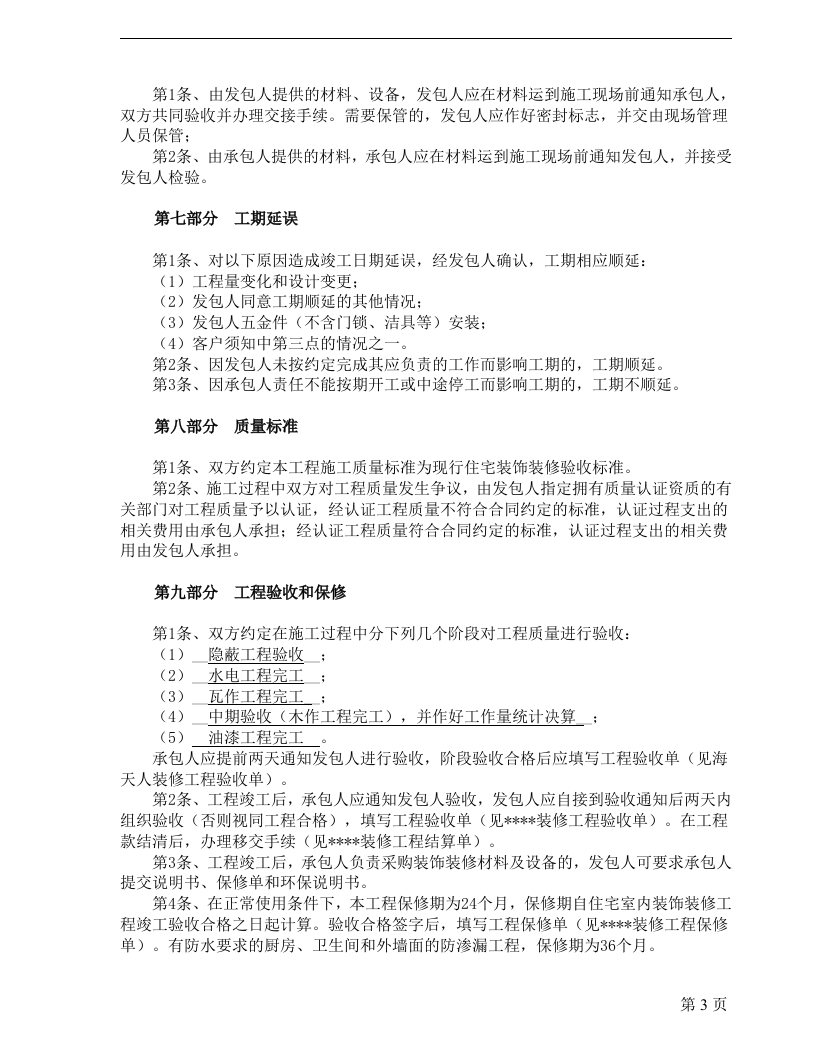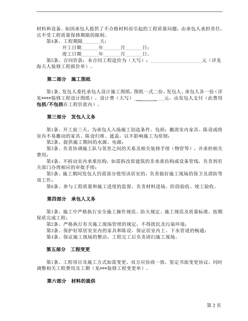家庭居室装饰装修工程施工合同合同编号:发包人(甲方):住所:委托代理人:电话:承包人(乙方):**装饰有限公司住所:营业执照号:法定代表人:电话:委托代理人:电话:本程设计人:电话:施工负责人:电话:依照《中华人民共和国合同法》及有关法律、法规的规定,结合家庭居室装饰装修工程施工的特点,双方在平等、自愿、协商一致的基础上,就发包人的家庭居室装饰装修工程(以下简称工程)的有关事宜,达成如下协议:第一部分工程概况第1条、工程地点:第2条、工程内容及做法(详见海天人装修工程施工项目确认表及报价单)。第3条、工程承包方式:双方商定采取以下承包方式:(1)承包人包工、部分包料(详见报价单),发包人提供部分材料(详见报价说明):(2)承包人要求发包人提供的材料数量应符合实际施工的要求,与工程实际使用量的误差应在+-5%以内。因超出此误差范围而导致发包人多次购买、材料浪费、延误工期、影响质量等责任由承包人承担。(3)由承包人提供的材料必须符合国家标准,有质量检验合格证明和有中文标识的产品名称、规格、型号、生产厂厂名、厂址等。禁止使用国家明令淘汰的建筑装饰装修第1页