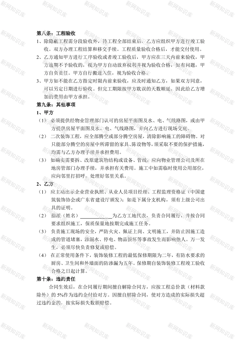 房屋装修合同委托方(甲方):承接方(乙方):甲、乙双方经友好洽谈和协商,甲方决定委托乙方进行居室装潢。为保证工程顺利进行,根据国家有关法律规定,双方自愿签订本合同(包括本合同附件和所有补充合同),以便共同遵守。第一条:工程概述1、工程名称:2、工程地点:3、施工面积:4、工程施工安装内容以双方签认的工程报价单中项目为准:施工费用以双方签认的工程报价单中单价位依据,按实际工程量结算:增减项目需经甲乙双方协商确定单价签认后生效,增减计施工、安装项目。5、双方商定本工程个工作日,乙方按时按质完成全部施工及安装项目。即自20年月日起(工期以施工材料进场的第二天计)。第二条:甲方工作1、开工前,全部腾空或部分腾空房屋,清除影响施工的障碍物,对只能部分腾空的房屋中所滞留的家具、陈设等应采取保护和安放措施,若因甲方不采取必要的保护和安放措施而造成家具、陈设的损失由甲方承担。2、乙方提供施工所需的水、电等设施。3、协助乙方办理施工申请、审批等手续,并缴纳物业管理处所收的一切费用。4、工程质量、进度进行监督检查,办理变更、验收、登记手续和其它事宜。5、按时、按质、按量提供施工所需一甲方采购的材料。第三条:乙方工作1、按合同要求组织施工,保质、保量按期完成施工任务:解决由乙方负责的各项事宜。2、严格执行施工规范、安全操作规程、防火安全规定,对施工现场的防火安全负责。3、严格按照双方签认的图纸或说明进行施工,做好各项质量检查和施工记录。4、工程竣工未移交甲方之前,负责对现场的设施和施工成品进行保护。第四条:质量要求1、工程使用主要材料的品种、规格、名称,经双方认可。详见本合同附件(1)《装饰装修工程材料预算清单元》。