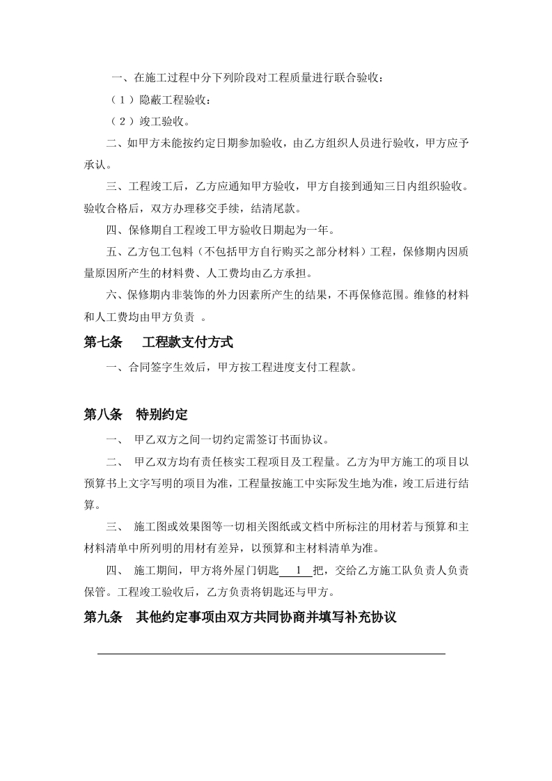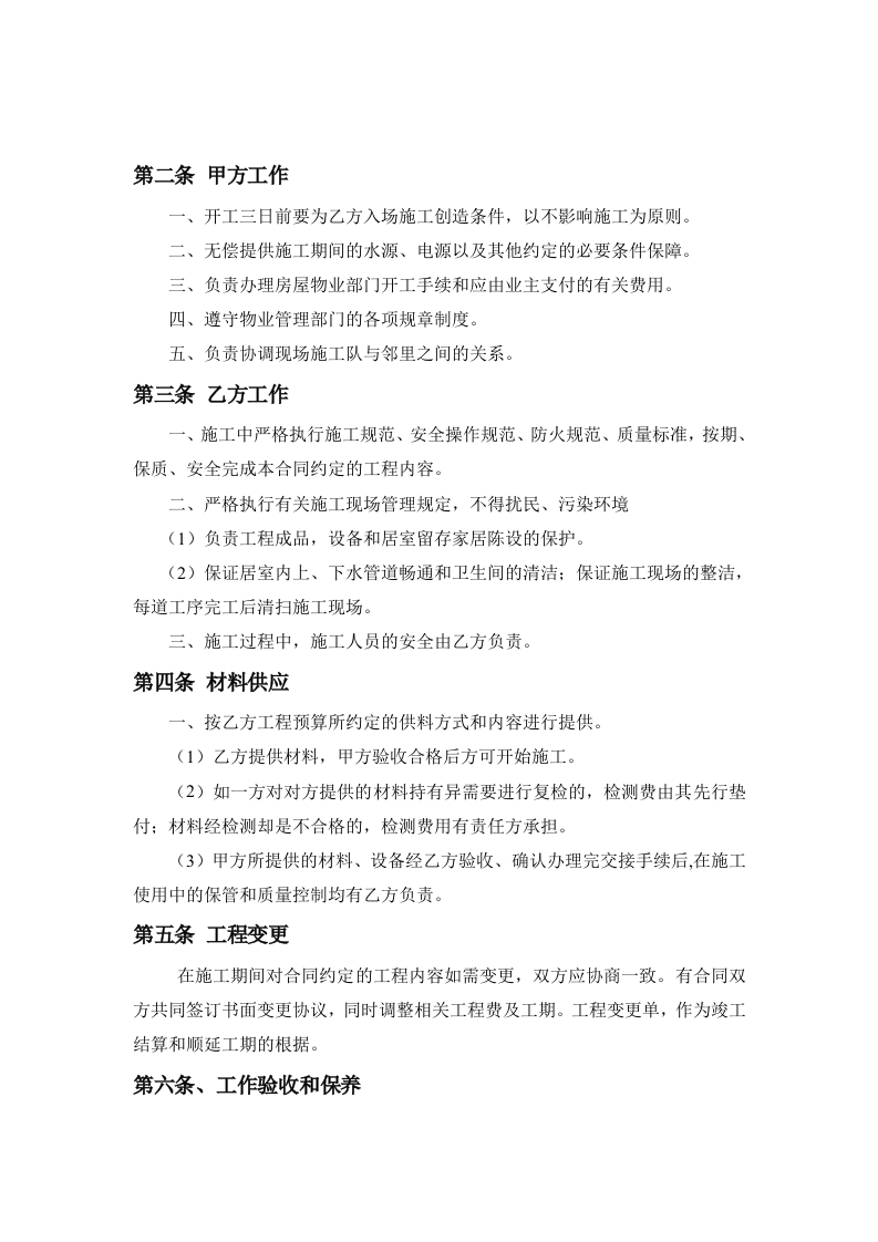 房屋装修工程施工合同协议条款发包方(以下简称甲方):联系电话:承包方(以下简称乙方):联系电话依照《中华人民共和国合同法》及其它有关法律,法规的规定,甲、乙双方在平等、自愿、协商一致的基础上,就乙方承包甲方的家庭居室装饰装修工程(以下简称工程)的有关事宜,达成如下协议:第一条工程概况一、工程名称(地址):二、工程装饰装修面积:三、工程户型:四、施工内容:详见本合同附件(一):预算表及有关设计方案、施工图纸。五、承包方式:乙方包工并部分包料,甲方提供其余部分材料六、工期:开工日期:XX年XX月XX日竣工日期:XX年XX月XX日总工期限:XX天七、合同总款:本合同工程造价为(人民币)金额大写(人民币):