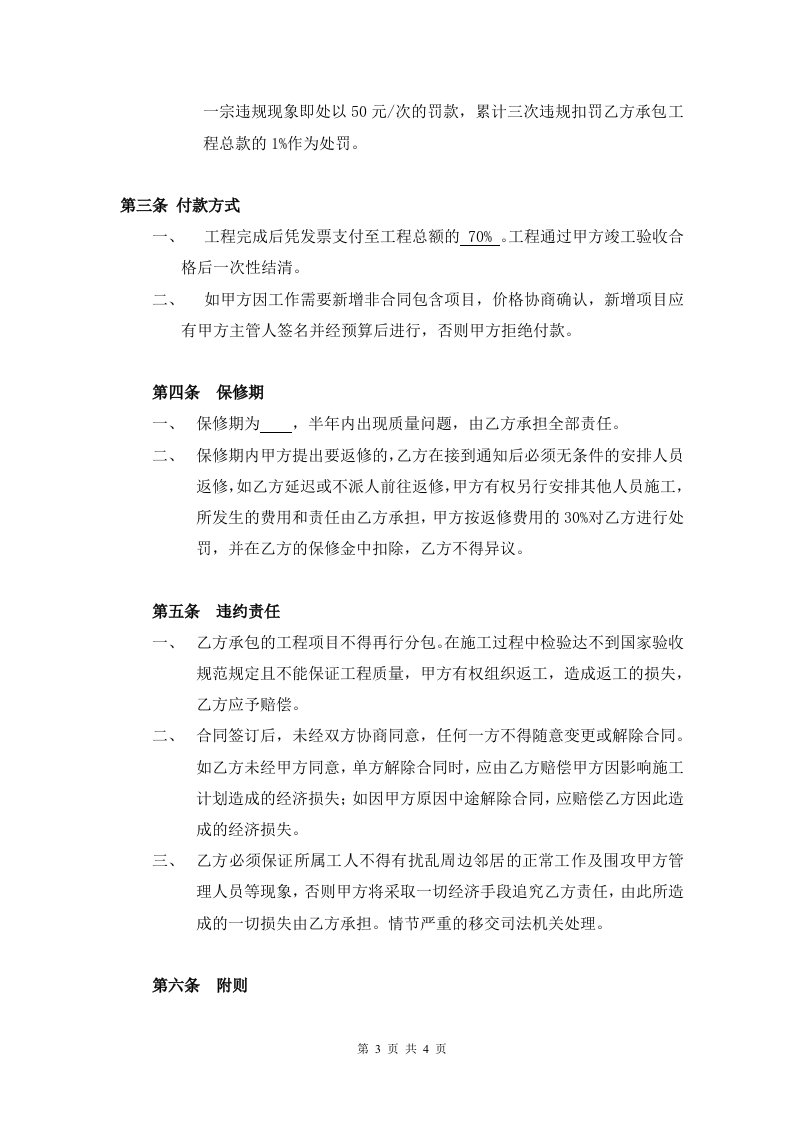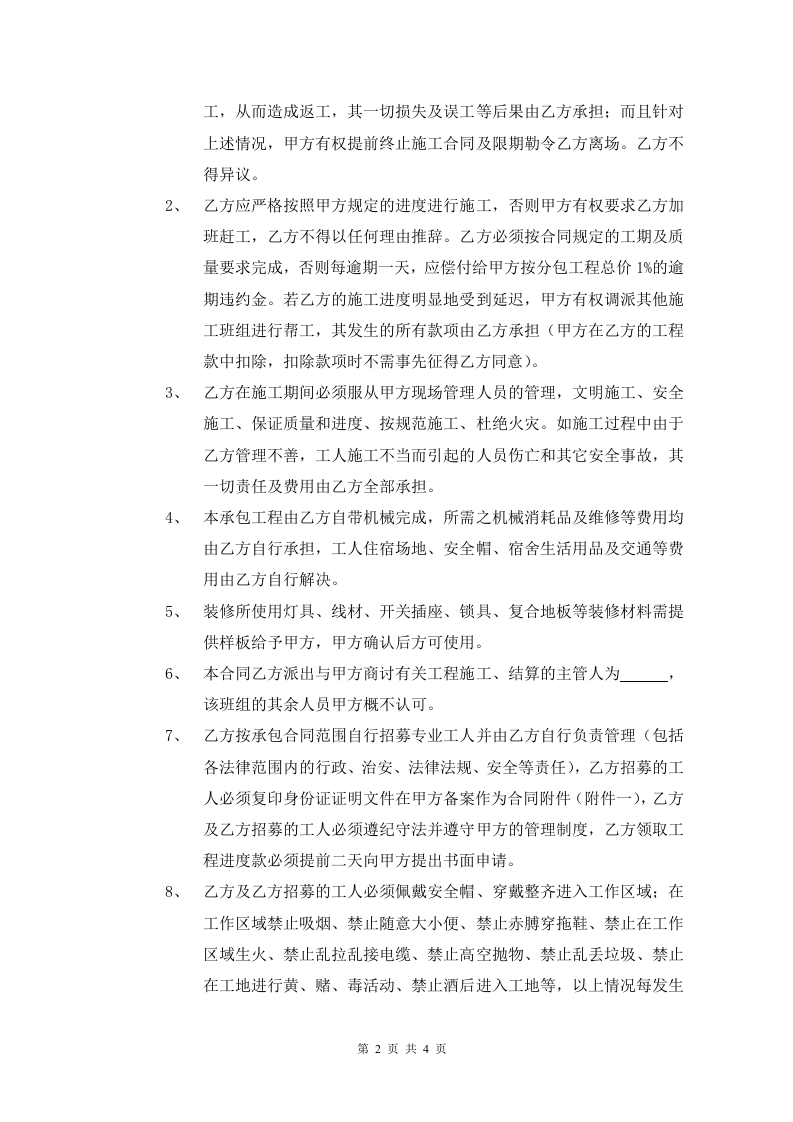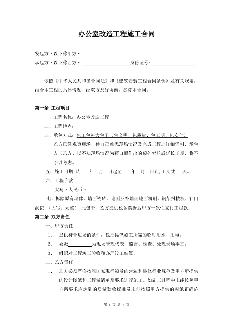 办公室改造工程施工合同发包方(以下称甲方):承包方(以下称乙方):身份证号:依照《中华人民共和国合同法》和《建筑安装工程合同条例》及有关规定,结合本工程的具体情况,经双方友好协商,签订本合同。第一条工程项目一、工程名称:办公室改造工程二、工程地点:三、承包方式:包工包料大包于(包文明、包质量、包工期、包安全)乙方已经观察现场,使自己熟悉现场情况及完成工程之详细资料,承包方(乙方)以不知现场情况为藉口而作出的额外索赔或延长工期,将不予以考虑。五、施工日期:从年_月_日起至年_月_日止,工期共一天。六、工程价款:大写(人民币):七、拆除原有墙体、墙面瓷砖、地面及补墙面地面粉刷、钢架封楼板、补门洞按(大写:元整)元包干,乙方提供税务票据后甲方一次性支付工程款。第二条双方责任一、甲方责任1、提供符合进场的条件,包括提供施工所需的临时用水、用电。2、委派为现场管理代表,监督、检查、处理现场事宜。3、组织对工程竣工验收和办理竣工结算。二、乙方责任1、乙方必须严格按照国家现行颁发的建筑和装修行业规范及甲方所提供的设计图纸和工程量清单及要求进行施工。如施工过程中未能按照甲方所要求应达到的质量验收标准及未能按照甲方提供的图纸正确施第1页共4页