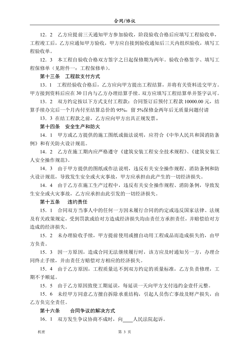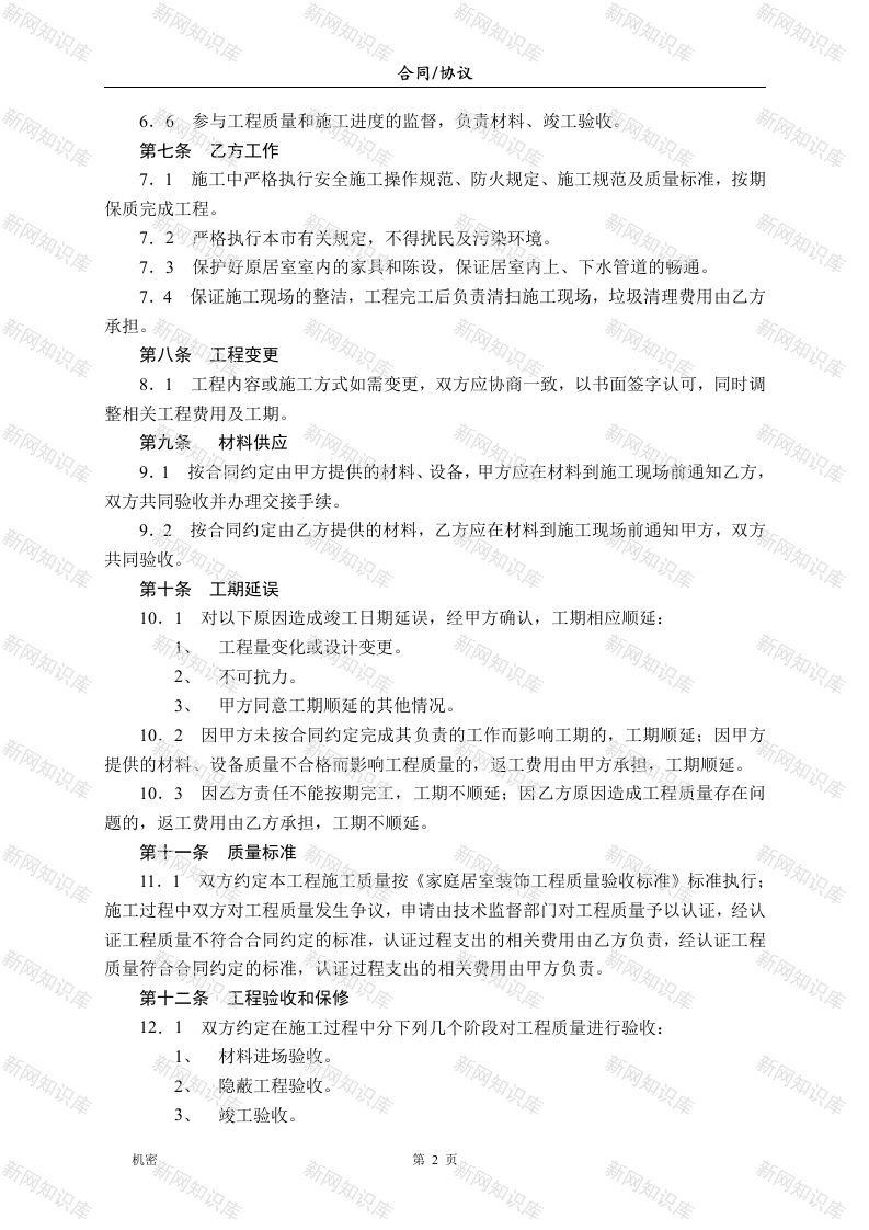合同/协议办公楼装饰装修工程施工合同发包方(以下简称甲方):承包方(以下简称乙方):本工程设计人:联系电话:施工队负责人:联系电话:依照《中华人民共和国合同法》及其它有关法律、法规的规定,结合本市家庭居室装饰装修的特点,甲乙双方在平等、自愿、协商一致的基础上,就乙方承包甲方的办公楼装饰装修工程(以下简称工程)的有关事宜,达成如下协议:第一条工程概况1.1工程地点:1.2工程内容及做法:1.3工程承包方式:乙方包工、包辅材,甲方供应主材。第二条包工程工期2.1工程期限:天(以实际工作日为准)。2.2开工日期:年月日。2.3竣工日期:年月日。第三条合同价款3.1合同价款:本合同包干价(人民币)¥元。(包人工费及辅材,主材由甲方供应,见附件三:甲方供项目主材料单)3.2金额大写:万元整。第四条工程监理4.1若本工程实行工程监理,甲方与监理公司另行签订《工程监理合同》,并将监理工程师的姓名、单位、联系方式及监理工程师的职责等通知乙方。第五条施工图纸5.1双方商定施工图纸采取以下方式提供:甲方委托乙方设计施工图纸,图纸一式三份,甲方执二份、乙方执一份,设计费由乙方承担。第六条甲方工作6.1开工前三天,为乙方入场施工创造条件,办理施工所涉及的各种申请、批件等手续。6.2提供施工期间的水源、电源到施工现场。6.3负责协调施工队与邻里之间的关系。6.4不拆动室内承重结构,如需拆除原建筑的非承重结构或设备管线,负责到有关部门办理相应的审批手续。6.5协调有关部门做好施工现场的保卫、消防及垃圾处理等工作。机密第1页