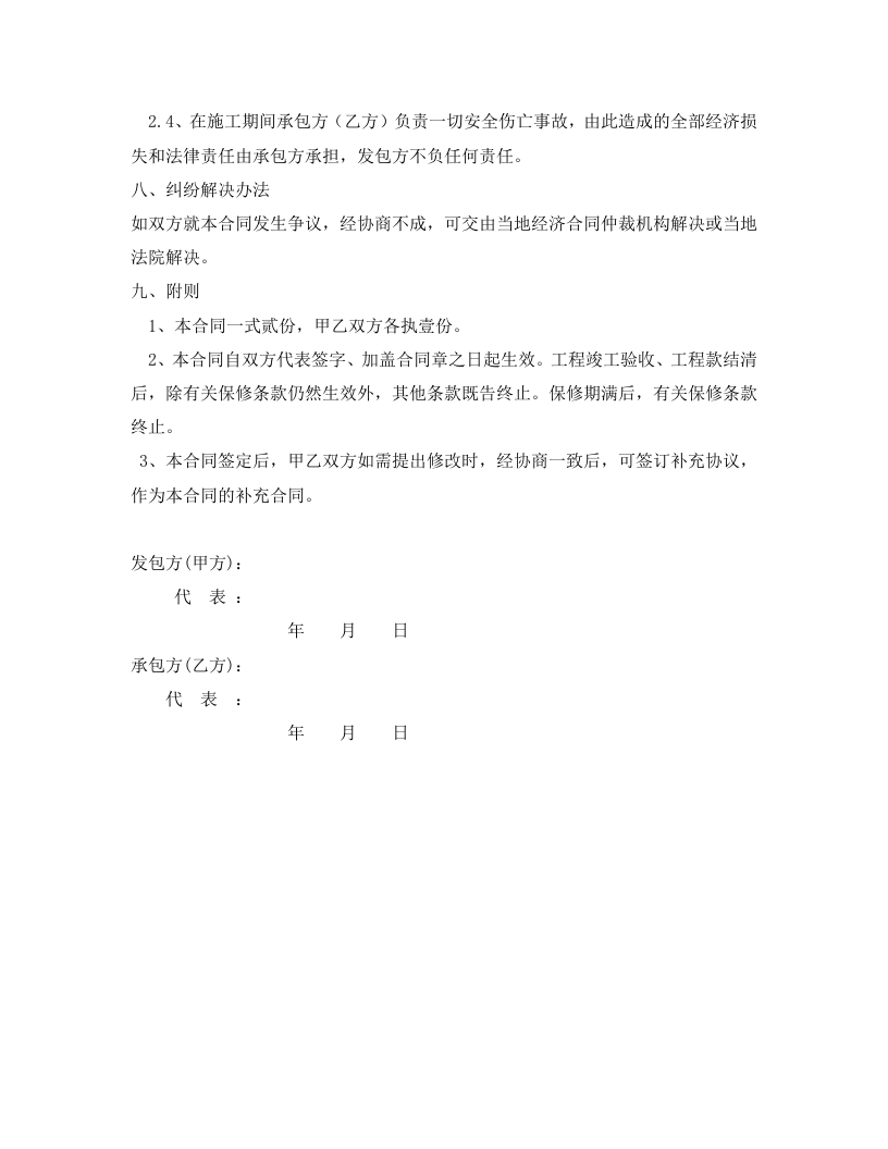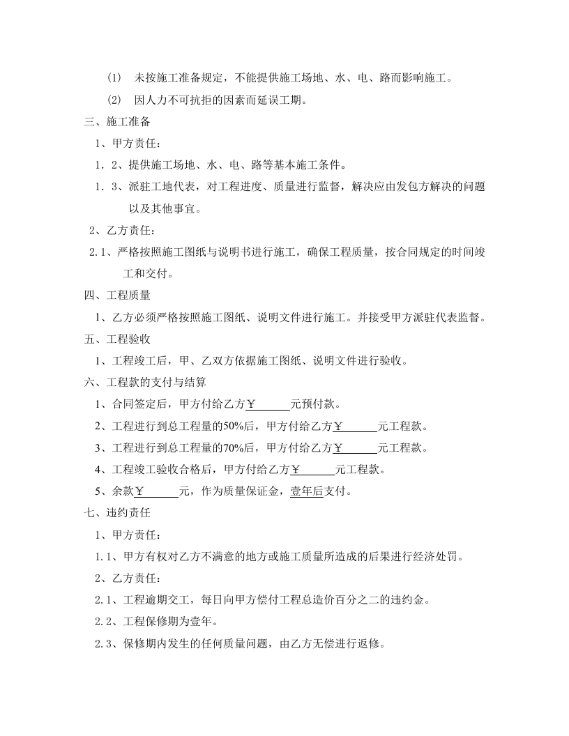 办公楼工程施工承包合同发包方(甲方):XXXXXXXX承包方(乙方):甲、乙双方依照《中华人民共和国合同法》、《中华人民共和国建筑法》、《建筑安装工程承包合同条例》及其他有关法律、行政法规,遵循平等、自愿、公平和诚实守信的原则,就乙方承包甲方办公楼改造工程事宜,签订本合同。一、工程项目1、工程名称:XXX办公楼改造2、工程地点:巡3、承包范围和内容:办公楼改造名称平米数单价合计隔断XXX刮泥子XXX铝合金门窗XXX不锈钢门窗XXX门台、大理石XXX打门口XXX铺面包砖XXX柜台XXx新装暖气XxX铺地板XXX4、工程总价:¥:元(大写:XXX。)5、承包方式:二、工程期限1、本工程按工期定额和有关规定,施工工期15天(日历天数),Xx年XX月Xx日开工,Xx年XX月Xx日完工。2、如遇下列情况,工期可顺延: