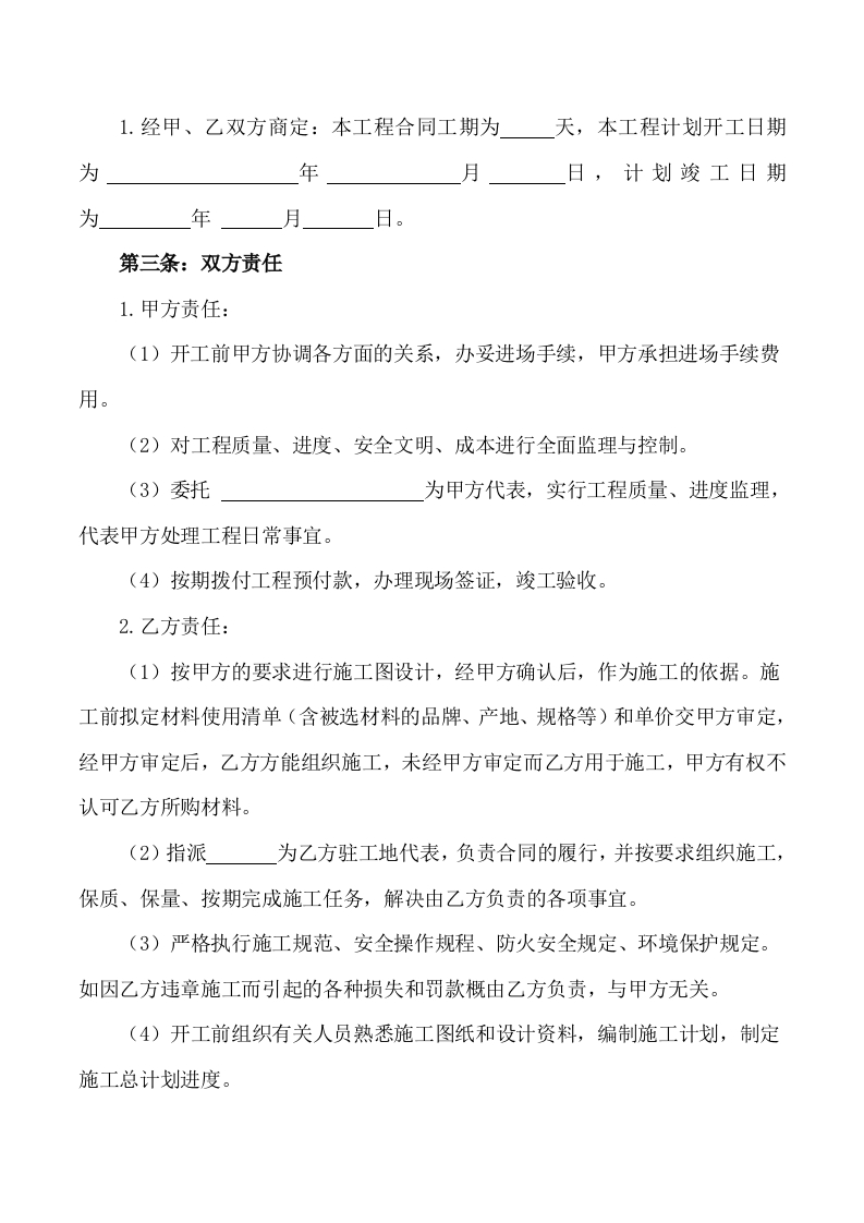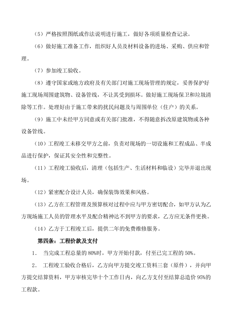 办公室装饰装修工程合同合同编号:发包人:(以下简称甲方)承包人:(以下简称乙方)依照《中华人民共和国合同法》、《中华人民共和国建筑法》及其他有关法律、行政法规,遵循平等、自愿、公平和诚实信用的原则,双方就本装饰、装修工程施工事项协商一致,订立本合同。第一条:工程概况1.工程名称:装修工程2.工程地点:3.施工面积:建筑面积1569.87平方米。结构形式:钢混结构4.工程范围:(1)水、电、暖气改造安装:(2)internet网络线路、电话线路布局(3)地面、墙体、房项改造及房间隔断布置(4)消防改造等。5.工程承包方式:采用总承包(包工、包料、包质量、包工期、包设计细化、包相关单位如:物业、消防验收)方式包工包料。(由乙方提供材料清单)6.工程造价:工程预算总造价为¥元,大写人民币:元整。第二条:工程期限
