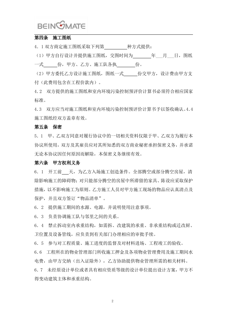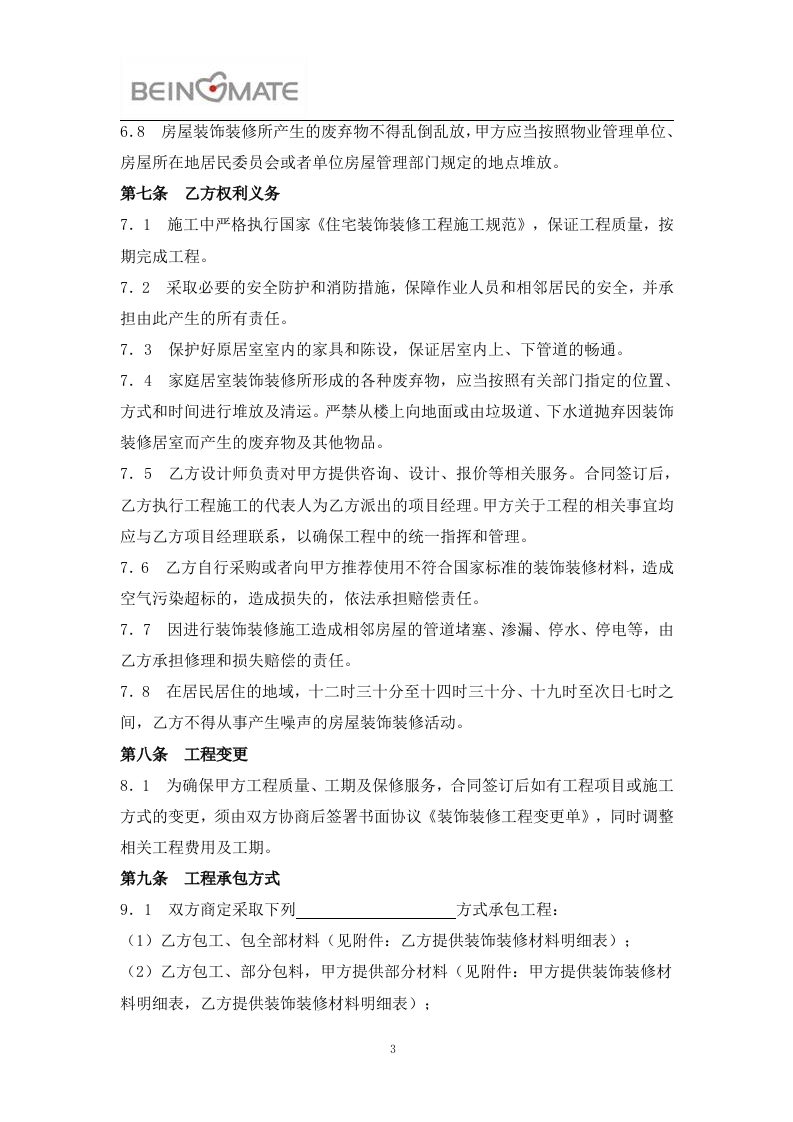 BEING☑MATE和谐美居装饰装修合同合同编号:甲方(发包方):乙方(承包方):武汉和谐美居装饰工程有限公司第一条工程概祝1.1工程地点:住房结构:施工面积平方米。1.2工程造价:总价款:元,大写(整)(详见附表:装修工程报价单)。经双方认可,变更施工内容,变更部分的工程款按实另计。1.3本着双方诚信、公开原则,同时为避免欺骗、隐瞒性行为发生,乙方郑重承诺,乙方提供的标的物的价格为同期同质最低价格,否则乙方自愿补偿双方合作总额价格差异的两倍及甲方因此产生的全部损失。1.4工程期限天:开工日期年月日,竣工日期年月日。1.5工程内容及做法(见附件:装饰装修工程施工项目确认表、装饰装修工程内容和做法一览表)。第二条施工单位资格2.1乙方应当持有建设行政主管部门颁发的具有建筑装饰装修工程承包范围的《建筑业企业资质证书》。2.2乙方是经过工商行政管理机关核准登记的企业法人,通过最近一次企业年检,具有经建设行政主管机关审定的从事民用建筑装饰装修工程的资质,资质等级符合本次施工的要求。乙方不具备营业资格或相应资质的,甲方有权终止本合同,乙方应当立即返还甲方已支付的费用,并赔偿损失。第三条工程监理若本工程实行工程监理,甲方与监理公司另行签订《工程监理合同》,并将监理工程师的姓名、单位、联系方式及监理工程师的职责等通知乙方。