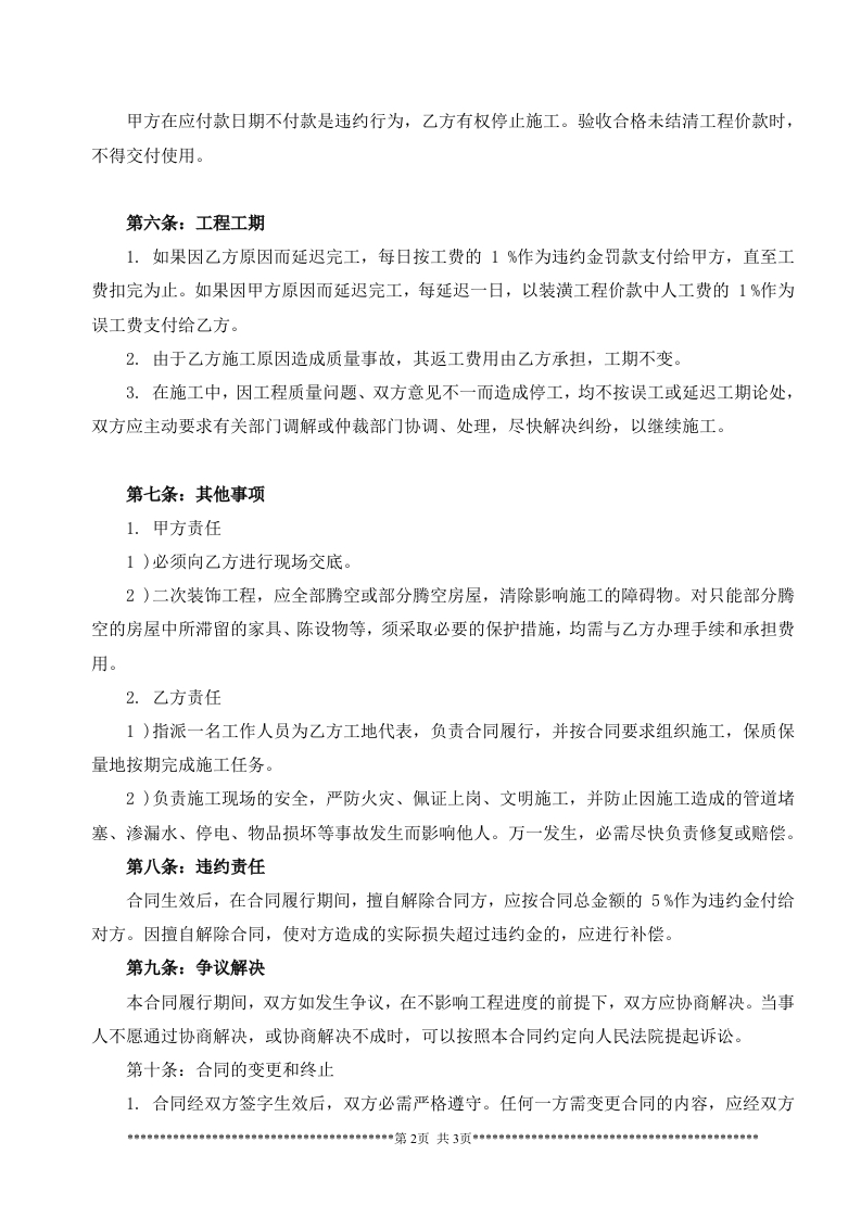 教室装修合同(供电、网络)委托方(甲方):承接方(乙方):甲、乙双方经友好洽谈和协商,甲方决定委托乙方进行寝室和教室供电线路装修。为保证工程顺利进行,根据国家有关法律规定,特签订本合同,以便共同遵守。第一条:工程概况1.工程地址:于都县天润实验学校内老宿舍和北二楼2.施工内容:教学楼北二楼五个教室,统一线槽布线,保证空调、照明正常工作(分两路),网络接到教室黑板左侧,音箱挂在黑板右上方,安装音箱控制开关,风扇安装(风扇学校采购):从新宿舍楼顶的空气能中把热水引到老宿舍四层16个寝室的供水改造工程(不含智能控制水表),16个寝室卫生间的排污工程。4.委托方式:包工包料5.开工日期:2015年7月10日,竣工日期2015年8月10日。第二条:工程价款工程价款预计(金额大写)肆万伍仟元整(含税)。工程结束后如有超过预计,按实际情况结算。第三条:质量要求1.工程使用主要材料的品种、规格、名称,经双方认可。2.工程验收标准,双方同意参照国家的相关规定执行。第四条:材料供应1.乙方所提供的材料均应用于本合同规定的装潢工程,非经甲方同意,不得挪作他用。乙方如挪作他用,应按挪用材料的双倍价款补偿给甲方。2.乙方负责采购供应的材料、设备,应该是符合设计要求的合格产品,并应按时供应到现场。材料由乙方负责保管,由于保管不当而造成损失,由乙方负责。第五条:付款方式1.合同一经签订,甲方即应支付工程款的30%:当工期进度过半,甲方即第二次付40%。剩余30%尾款待甲方对工程竣工验收后结算。(注:施工工费包括人工费)。