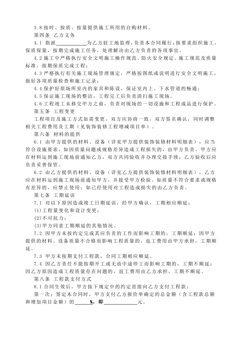 装修合同范本(家装)xmtt885个月前发布关注私信45.50KB5页04313 第1页 / 共5页 第2页 / 共5页 第3页 / 共5页 试读已结束,还剩2页,您可下载完整版后进行离线阅读 装修合同范本(家装)此内容为付费资源,请付费后查看¥5¥8会员服务免费立即购买您当前未登录!建议登陆后购买,可保存购买订单付费资源© 版权声明文章版权归作者所有,未经允许请勿转载。THE END装修合同 文本预览 东莞市×XX装饰工程有限公司装饰装修工程承包合合同编号:HBN-20110000-jz00二零一一年月日 查看更多 收起部分 喜欢就支持一下吧点赞13 分享QQ空间微博QQ好友海报分享复制链接收藏