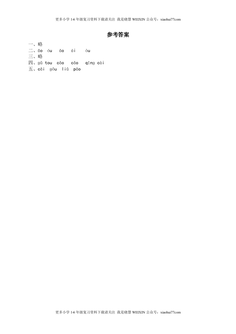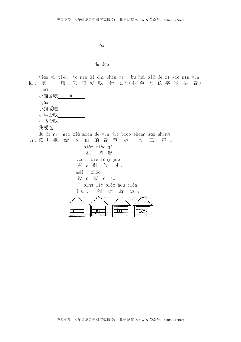 更多小学16年级复习资料下载请关注我是晓慧WEIXIN公众号:xiaohui77com10aoou iuwo hui xie chu dai dido de fu yun mu一、我会写出带调的复韵母。aoouiukan tu xuan yun mu tian yi tian二、看图选韵母,填一填。ou ai ouǎ0hud mzhi pd拉ddu yi du lian yi lian三、读一读,连一连。piqiúshu yexido nidoyu mao6年级复习资料下载请关注我是晓慧WEXN公众号:xiaohui77com
