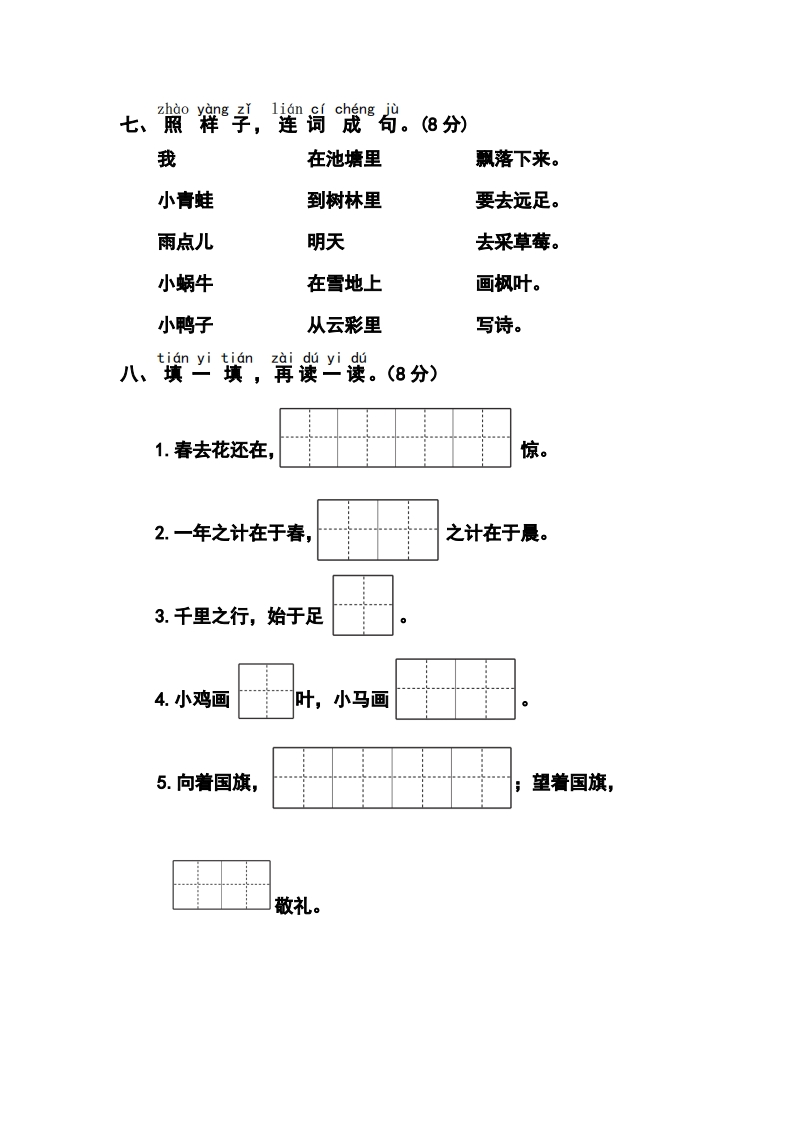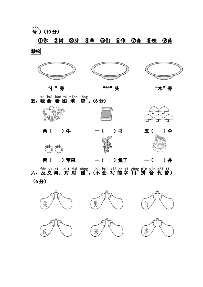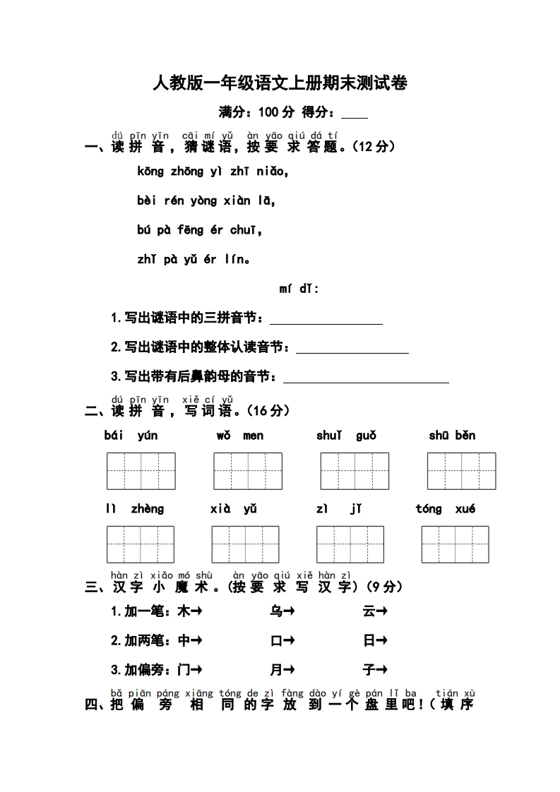 人教版一年级语文上册期末测试卷满分:100分得分:一、美拼置,霜遂當,投宴哭馨藏。(12分)kong zhong yl zhT nido,bei ren yong xian la,búpa fengér chuT,zhT pa yǔr Ifnomf dT:1.写出谜语中的三拼音节:2.写出谜语中的整体认读音节:3.写出带有后鼻韵母的音节:二、選置,雪词谱。(16分)bai yunwǒmenshuT guǒshūběnzhengxiàyǔzljYtong xue三、贺旱置米。锻霎求鸳贺学)9分)1.加一笔:木→乌→云+2.加两笔:中→▣→日→3.加偏旁:门→月→子+四、抢篇雾“招筒的學掇勤”来置里电!(岸