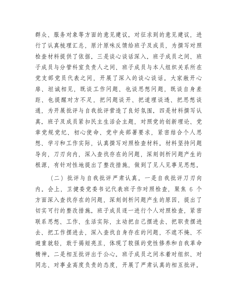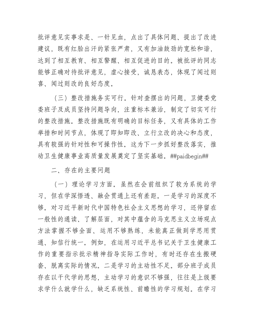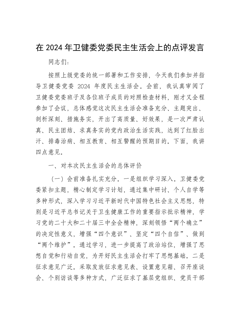 在2024年卫健委党委民主生活会上的点评发同志们:按照上级党委的统一部署和工作安排,今天我们参加并指导卫健委党委2024年度民主生活会。会前,我认真审阅了卫健委党委班子及各位班子成员的对照检查材料,刚才又全程参加了会议,总体感觉这次民主生活会准备充分、主题突出、剖析深刻、措施务实,开出了高质量、好效果,是一次严肃认真、民主团结、求真务实的党内政治生活实践,达到了红脸出汗、排毒治病、相互教育、相互警醒的预期目的。下面,我讲四点意见。一、对本次民主生活会的总体评价(一)会前准备扎实充分。一是组织学习深入。卫健委党委紧扣主题,精心制定学习计划,通过集中研讨、个人自学等多种形式,深入学习习近平新时代中国特色社会主义思想,特别是习近平总书记关于卫生健康工作的重要指示批示精神,学习党的二十大和二十届三中全会精神,深刻领悟“两个确立”的决定性意义,增强“四个意识”、坚定“四个自信”、做到“两个维护”。通过学习,进一步提高了政治站位,增强了思想自觉和行动自觉,为开好民主生活会打牢了思想基础。二是征求意见广泛。采取发放征求意见表、设置意见箱、召开座谈会、个别访谈等多种方式,广泛征求了基层党组织、党员干部