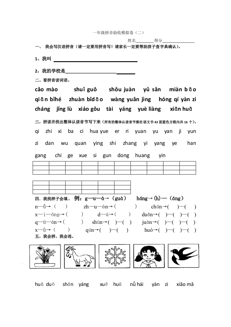 一年级拼音验收模拟卷(一)姓名得分一、把下面的拼音正确地写在四线格里。gunnei zhao quanjiūěrǚnyuehuan guang二、按字母的顺序填空(提示:按照语文书52面的顺序)。a】eiub()()fdt()(()eiuiiX(ch ()sh ran()()un()ie()(ang()ing(四、认读韵母:ao aiang an ooue eierenengiiu ieeu ongui uue ingun unie ue五、拼读音节xiao cǎoshizili zhTbōlu6luoboluòtuoshǒutaoyětùzuòxiaci weizhuo yichūqùha mi guajiùhuǒmachēguo jialǜsèyushuiiúhuayue erwu heiqing tingshu caitao huaxi hong shi七、正确拼读句子1、wǒshi baimǎshi yan xiǎoxuédeuésheng,wǒdiwǒdexuéxido。2、wǒàiměi11dezǚgu6。3、wǒhua le y1 tiao měil1decǎihong。4、xiao mao ai chi yu.xiao gou ai chi rou。5、wan shang,.ba ba kan bao,,ma ma kan dian shi。6.qiu you de shi hou,ni dai le shen me dong xi?7、wǒde shu bao li you wen jùhéhéxiězibn。8、dong wu yuan lI you jIng cǎi de biǎoyn。9、xid xuěla,xiǎjI xiǎoyalái hua huà。