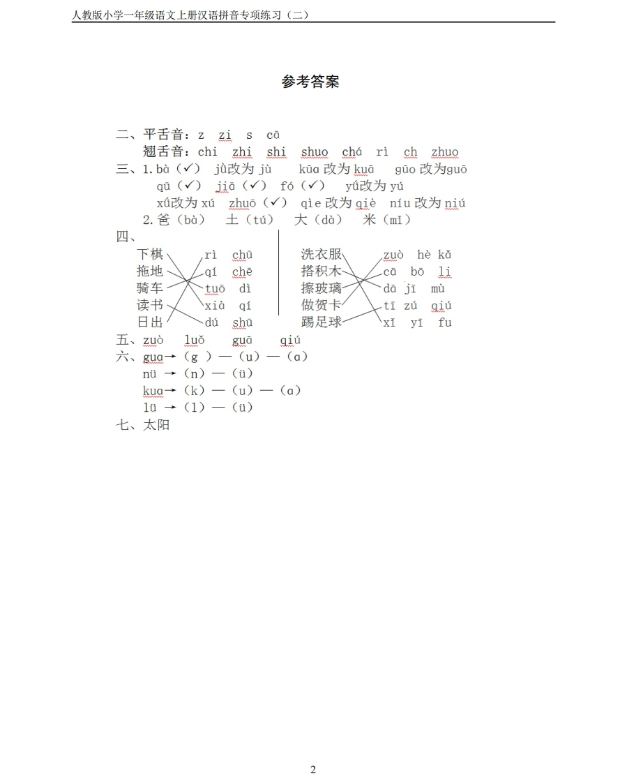 人教版小学一年级语文上册汉语拼音专项练习(二)一年级语文上册汉语拼音专项练习(二)ànshùnxùtian xieěsheng mǔ一、按顺序填写声母(16分)da(tǔ(爸ba(fǔ(da(mi(米ba(yòng xian bǎci yu he yin jie lian gr lai四、用线把词语和音节连起来(20分)下棋ri chu洗衣服zuòhèkǎgěi ping she yin tu hong se qicàoshe二、给平舌音涂红色,翘舌拖地gi che搭积木ca bo liyin tu lǜsè骑车tuo di擦玻璃da ji mù音涂绿色(12分)读书xia gi做贺卡ti zu qiuZchizhi日出dúshu踢足球xi yi fudu yi du zaiàn yao giu biao dicào五、读一读,再按要求标调(12分)shishuochazu0四声()Iuo三声(gu0一声(chzhuocawǒhui xieě六、我会写(20分)gua→()一()一()》wo lai dang dang xiao cai pannu→(三、我来当当小裁判(16分)》)一(kua→+(1.下列音节对不对?对的在括号里打))一()一()u→()一()“√”,错的改正。ba()jǜ(cai mi yǔkua(七、猜谜语(4分)g0o()q0(jia(有位老公公,一副圆面孔。fo()yu(xǘ(有朝一日不见他,不是下雨就刮风。zhuo()qie()niu()谜底:(2.选择正确的读音,在括号里打“√”。