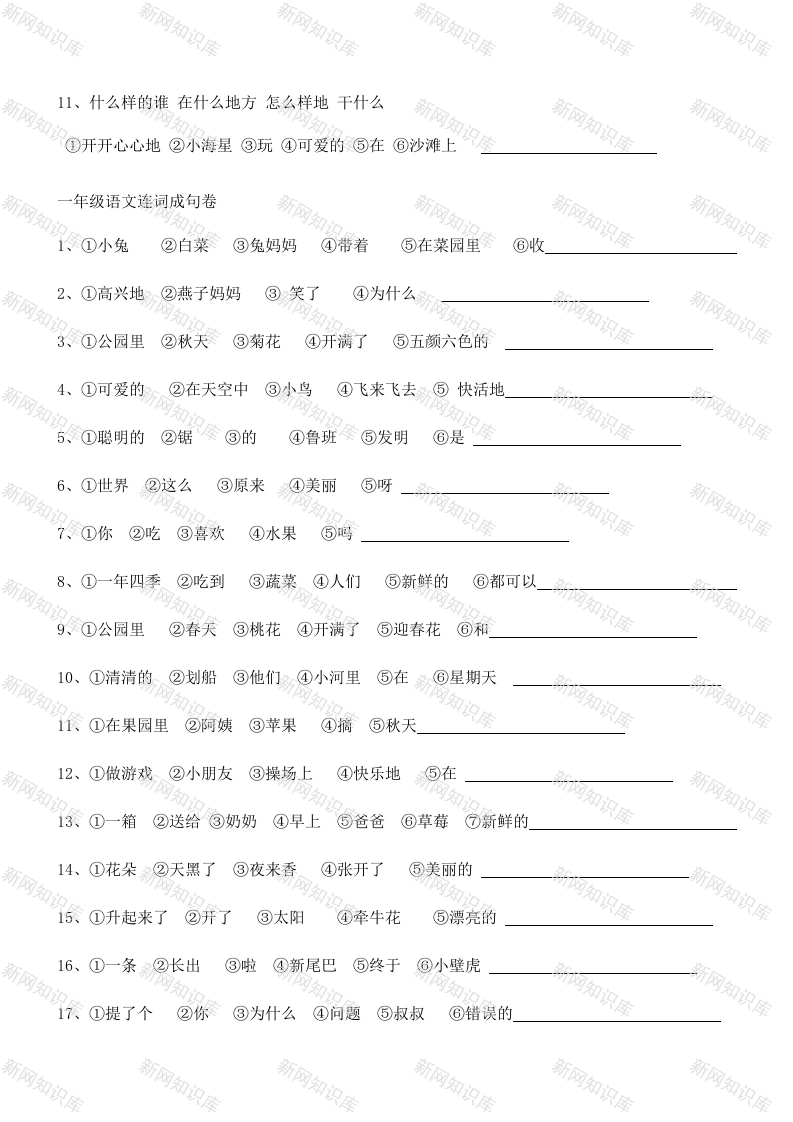 一年级连词成句基本句型1、谁干什么①往南②飞③燕子④一群⑤排着队2、谁在什么地方干什么①做游戏②小朋友③在操场上3、谁在什么地方干什么①小马②池塘边③在④喝水⑤清清的4、谁为谁干什么①为②买了③皮球④妈妈⑤一个⑥我5、谁带谁干什么①带②秋游③我们④老师⑤去6、谁和谁在什么地方干什么①小兔②草地上③在④和⑤赛跑⑥小马7、什么地方有什么①美丽的②有③池塘④一朵⑤荷花⑥里8、什么地方有什么在干什么①树林里②啄木鸟③在④为大树⑤有⑥治病⑦一只9、什么时候,谁怎么样地干什么①秋天②一群③往南飞④小燕子⑤排着队二、较复杂的句型10、谁在什么地方怎么样地干什么①做游戏②小朋友③在操场上④快乐地