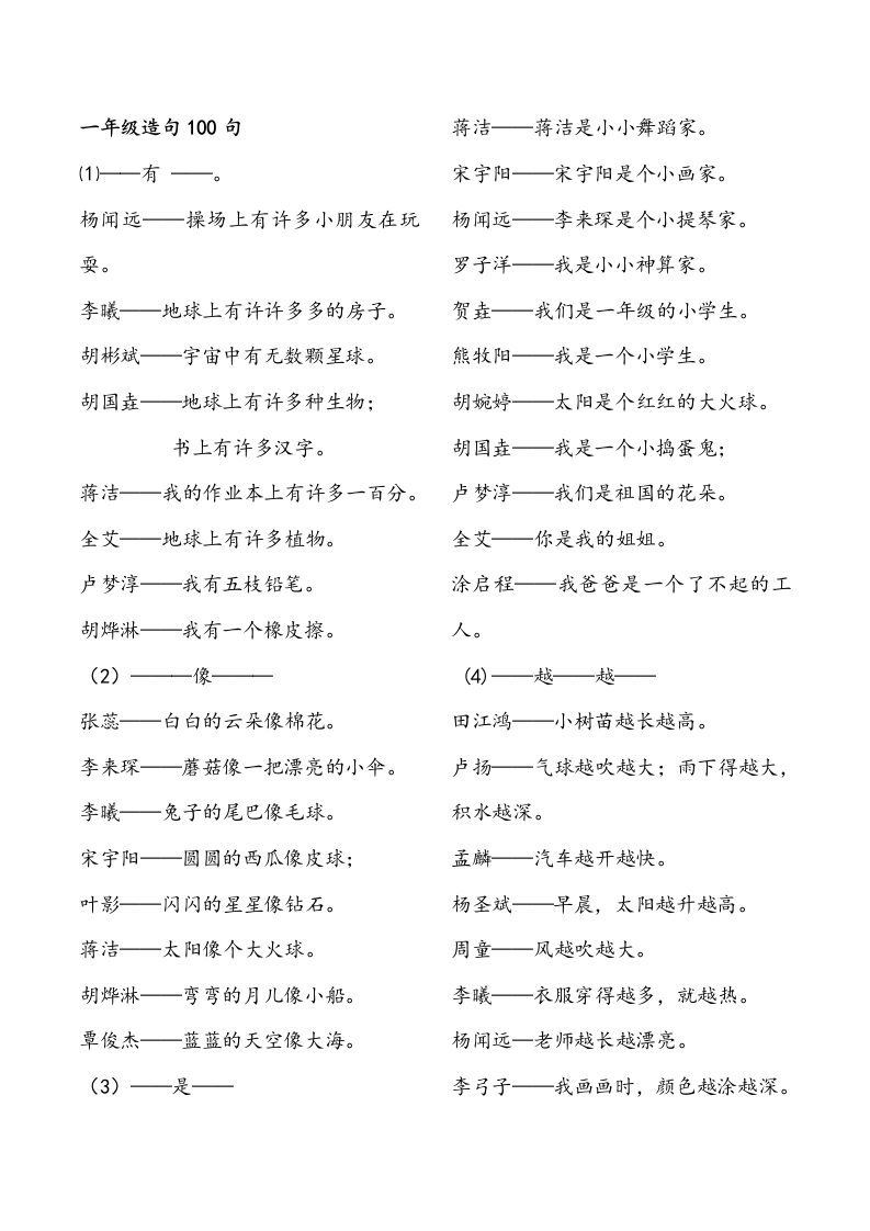 一年级造句100句蒋洁一蒋洁是小小舞蹈家。(1一有一。宋宇阳—宋宇阳是个小画家。杨闻远一操场上有许多小朋友在玩杨闻远一李来琛是个小提琴家。耍。罗子洋—我是小小神算家。李曦一地球上有许许多多的房子。贺垚一我们是一年级的小学生。胡彬斌一宇宙中有无数颗星球。熊牧阳一我是一个小学生。胡国垚一地球上有许多种生物:胡婉婷一太阳是个红红的大火球。书上有许多汉字。胡国垚—我是一个小捣蛋鬼:蒋洁一我的作业本上有许多一百分。卢梦淳—我们是祖国的花朵。全艾—地球上有许多植物。全艾一你是我的姐姐。卢梦淳一我有五枝铅笔。涂启程一我爸爸是一个了不起的工胡烨淋一我有一个橡皮擦。人(2)像(4)一越一越张蕊一白白的云朵像棉花。田江鸿一小树苗越长越高。李来琛一蘑菇像一把漂亮的小伞。卢扬一气球越吹越大;雨下得越大,李曦一兔子的尾巴像毛球。积水越深。宋宇阳—圆圆的西瓜像皮球;孟麟一汽车越开越快。叶影一闪闪的星星像钻石。杨圣斌一早晨,太阳越升越高。蒋洁—太阳像个大火球。周童一风越吹越大。胡烨淋一弯弯的月儿像小船。李曦一衣服穿得越多,就越热。覃俊杰—蓝蓝的天空像大海。杨闻远一老师越长越漂亮。(3)—是-李弓子一我画画时,颜色越涂越深。