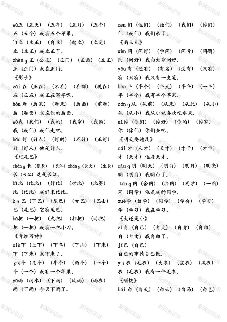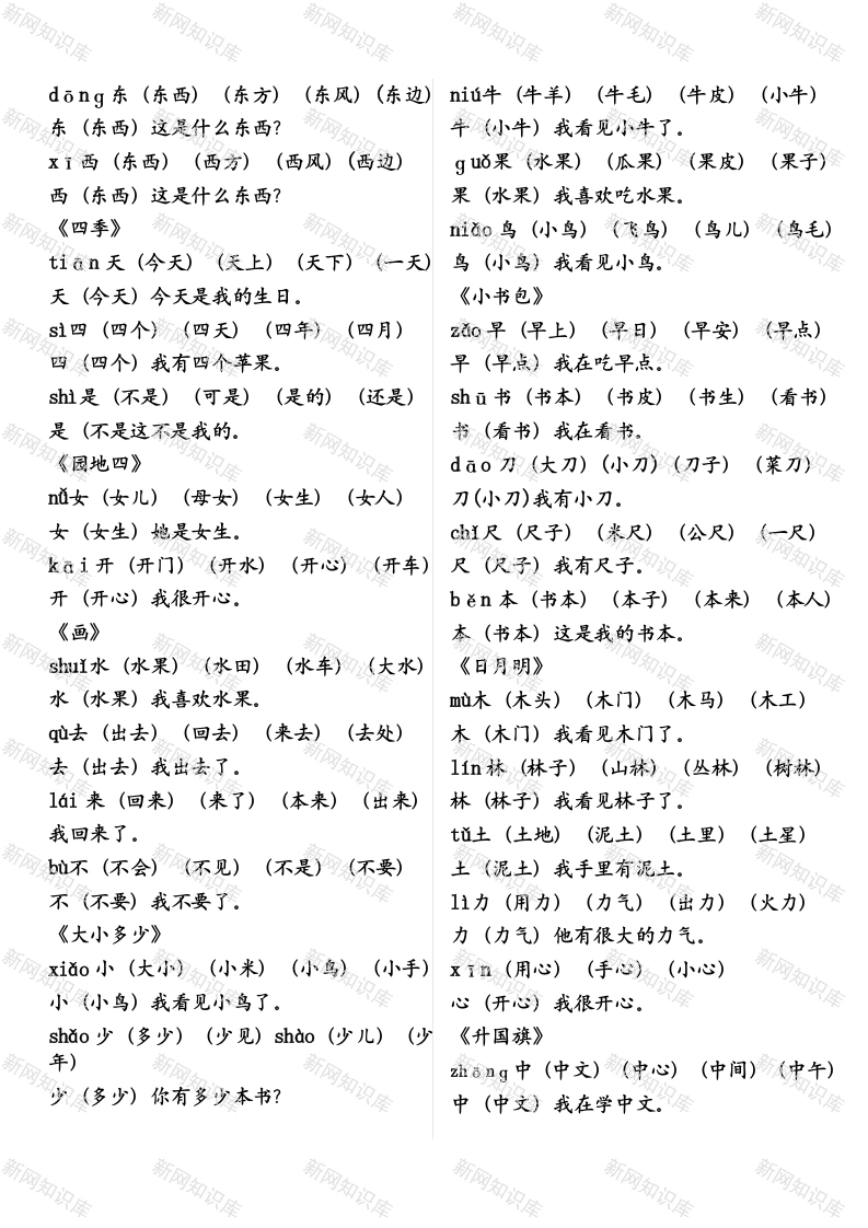 《金木水火土》虫(虫子)我看见虫子了.y1一(一个)(一人)(一只)(一本)yn云(白云)(鸟云)(云朵)(黑云)一(一本)我有一本书。云(白云)天上有白云。shān山(大山)(上山)(下山)(火山)èr二(二手)(二月)(二人)(二本)山(大山)我看见大山了.二(二本)我有二本书.《园地一》sān三(三天)(三个)(三年)(三只)bā八(八个)(八天)(八月)(八本)三(三只)天上有三只小鸟。八(八本)我有八本书。shàng上(上下)(上车)(上山)(上来)shí十(十个)(十天)(十年)(十月)上(上来)我上来了十(十个)我有十个苹果。《秋天》《口耳目》1e了(走了)(来了)(好了)(完了)ku口(出口)(门口)(开口)(口水)了(来了)我来了.口(门口)我在门口.z1子(儿子)(日子)(子女)(虫子)mù目(双目)(耳目)(目光)(书目)子(日子)今天是什么日子?目(双目)我有双目。r人(人口)(大人)(人生)(人力)ěr耳(木耳)(耳目)(耳朵)(中耳)人(大人)他是大人我有一双耳朵。dà大(大小)(大人)(大米)(大方)shǒu手(小手)(大手)(手心)(手足)大(大米)我喜欢吃大米。手(小手)我有一双小手。《小小的船》《日月水火》yuè月(月牙)(日月)(月亮)(十月)r1日(日子)(生日)(今日)(日本)月(月亮)天上有月亮。日(生日)今天是我的生日。r儿(儿子)(少儿)(女儿)(月儿)tin田(水田)(田里)(田地)(田园)儿(月儿)天上有月儿.田(田里)我在田里。tu头(木头)(开头)(心头)(个头)hé禾(禾田)(禾苗)头(木头)这是木头。禾(禾田)这里有禾苗。11里(心里)(手里)(里头)(里面)huǒ火(火车)(上火)(水火)(大火)里(里面)我在里面。火(火车)我看见火车了。《江南》《对韵歌》kě可(可口)(认可)(可以)(可能)chon g虫(飞虫)(虫子)(虫牙)(小虫)可(可以)你可以走了.