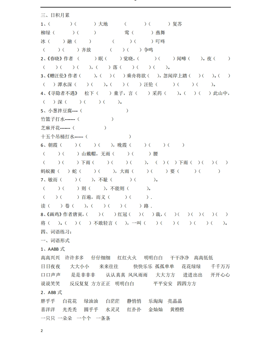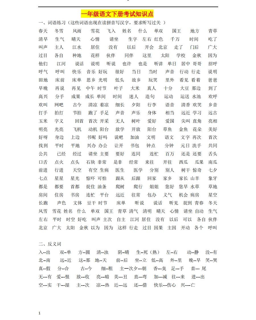 一年级语文下册考试知识点一、词语练习(这些词语出现在读拼音写汉字,要求听写过关)春天冬雪风雨雪花飞入姓名什么单双国王地方青草清早生气晴天心情请坐生字左右红色千万时间吃了叫声主人江水居住没有以后开会北京走了门后广大过目各自种地花样伙伴同伴这里太阳学校金秋因为他们江河说话说明听说也许也是听讲单日居中哥哥招呼呼气呼叫快乐音乐好玩很好当日当时声音行动行走说明田地床前床单思乡光明低头故乡玩笑里外看见看着爸爸早晚再说再见中午时节叶子大米真人十分大豆那边到了高兴分手成果成长单间时间迷人造句运动运送水池欢呼欢叫网吧古今清凉着凉细长夕阳行李语音清香欢笑乡音打手拍打节拍跑了手足声音声乐身体相当远近学习远古玉米字义回首首次开采无人树叶爱好爱国尖叫直角亮相明亮光亮飞机动机阳台放学开放阳台草鱼金鱼花朵美好好呀身边上边书呢好吗说吧加油文明语文文字再次首次找到平时平地兴办办公让开书包钟点分钟元日洗手共同公共已经经过请坐主要要好连同连忙百万还是还要舌头口舌点火点头石块非常是非经常来往开往西瓜瓜果南瓜前进行进天空有空生病医生医学分别别人树干惊奇七夕七点星星星光惊吓可怕跟从后跟回家家乡家长山羊象牙都是都要首都捉住油条爬树爬行姐姐您好您早水草草地房间住房书房连忙平台远近往常包办义气机会病房星空长跑声色文体豆干时节床单听说说话听见捉到青春冬天风雪雪花姓名什么单双国王青草清气清明晴天心情请坐自动生气左右平时时空好吃叫声主次自主江河居住没有以后可以各自伙伴北京广大太阳金秋以为因为这样行走过目因果主因开动各个呼叫二、反义词入出双-单方圆清-浊阴-晴生-死(熟)左右动静没有北-南远近这那地天前-后坐立低-高外-里晚早笑哭真-假分合古今细粗主一次夕朝香臭足-手首…尾无有爱恨放收亮暗美丑直弯加减往…来进-出空实干湿主.次凉热近…远还借快乐伤心兴-亡1