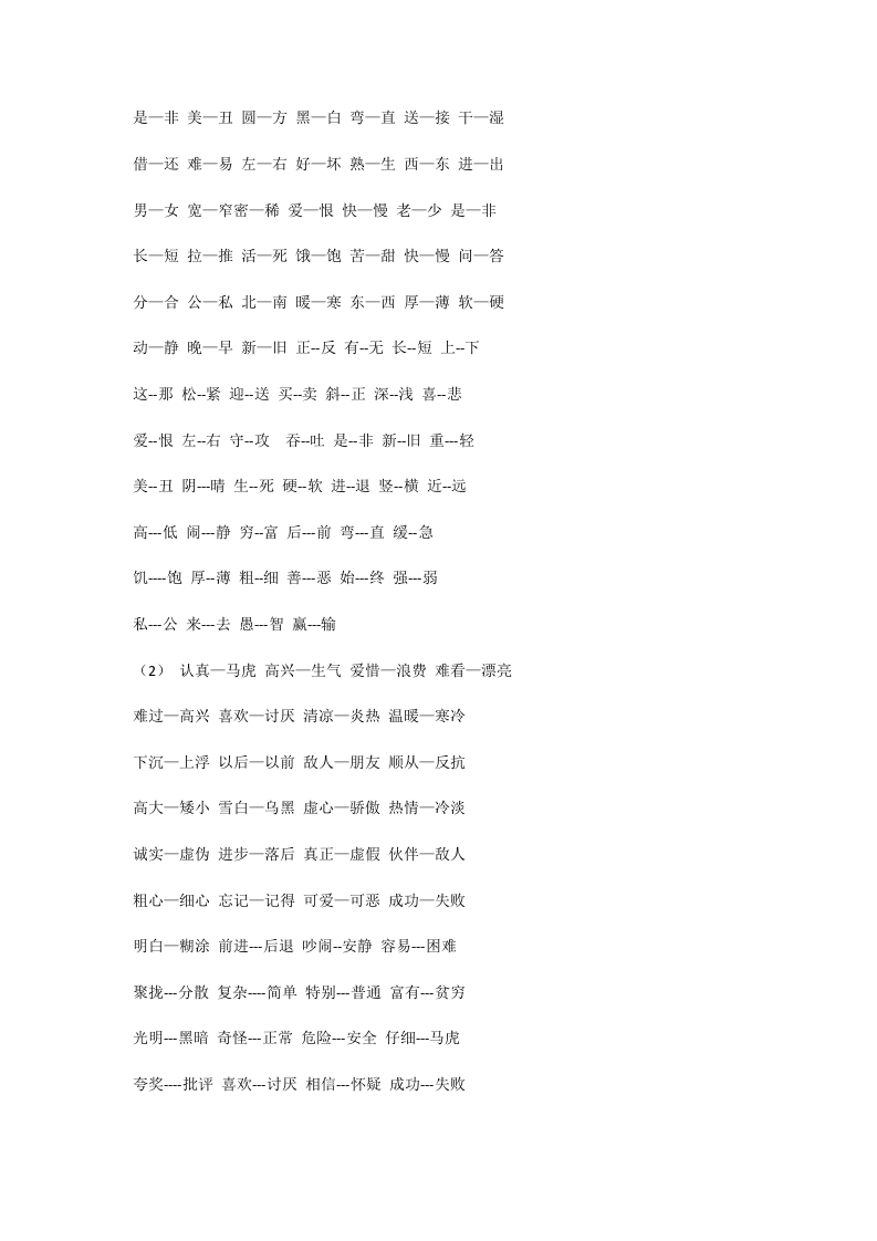 小学一年级语文下册近义词、反义词、开学前预习!近义词(1)看一望复一又啼一叫全一都关一合眠一睡闻一听闭一合傻一笨升一落叫一喊蹦一跳丹一红杀一宰(2)朋友一伙伴小心一仔细高兴一快乐好玩一有趣高兴一快乐刚才一刚刚美丽一漂亮快乐一欢快亲爱一散爱着急一焦急发现一发明快活一欢快陈旧一很旧遥远一远处清晨一早晨说谎一撒谎仿佛一好像难过一伤心洁净一干净希望一盼望抬头一昂首惊讶一吃惊热闹一吵闹称赞一表扬用心一专心缓缓一缓慢估计一猜测高兴一开心祝贺一庆祝亲切一亲密奇怪一稀奇温和一和气保护一保卫飞快一迅速观察一察看立刻一马上突然一忽然宽阔一辽阔仔细一认真简单一容易依靠一依赖反对一反驳(3)笑嘻嘻一笑眯眯高高兴兴一一快快乐乐反义词(1)大一小对一错开一关轻一重多一少忙一闲今一古真一假高一低好一坏笑一哭胖一瘦合一开放一收外一里男一女早一晚去一来朝一夕香一臭远一近前一后先一后明一暗无一有阴一阳闭一开坐一立