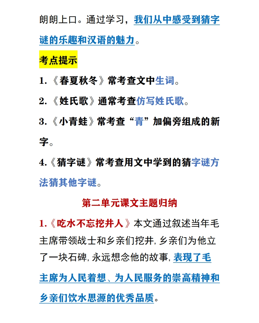 一年级语文下册<课文主题及考点提示>第一单元课文主题归纳1.《春夏秋冬》本课识字,通过一幅幅美丽的图画和一组组词语,向我们展现了一年四季美丽的景色。图文结合,我们不但了解了不同季节的特点,也认识了词语。2.《姓氏歌》本课识字是一首姓氏歌,告诉我们中国的姓氏多及一些常见姓氏的字形特点,读起来朗朗上口。我们不仅认识了这些姓氏,还了解了它们的构字特点。3.《小青蛙》是一首朗朗上口的儿歌,通过学习这首短小的儿歌,我们了解了形声字的特点,同时树立起爱护青蛙,保护益虫的环保意识。4.《猜字谜》本课是猜字谜小韵文,读起来