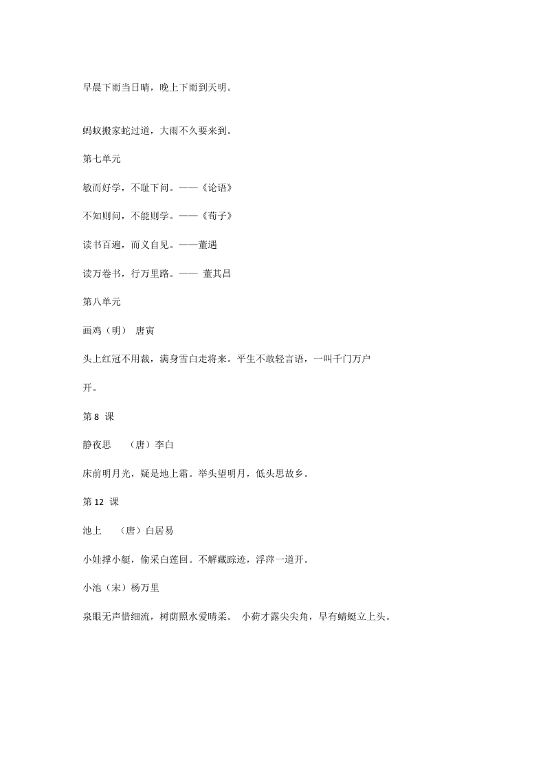 部编版语文一年级下册古诗和日积月累第一单元春回大地万物复苏柳绿花红莺歌燕舞冰雪融化泉水叮咚百花齐放百鸟争鸣第二单元春晓(唐)孟浩然春眠不觉晓,处处闻啼鸟。夜来风雨声,花落知多少。第三单元赠汪伦(唐)李白李白乘舟将欲行,忽闻岸上踏歌声。桃花潭水深千尺,不及汪伦送我情。第四单元寻隐者不遇(唐)贾岛松下问童子,言师采药去。只在此山中,云深不知处。第五单元歇后语:小葱拌豆腐一一一清(青)二白竹篮子打水一一一场空芝麻开花一一节节高十五个吊桶打水一一七上八下第六单元天气谚语:朝霞不出门,晚霞行千里。有雨山戴帽,无雨半山腰。