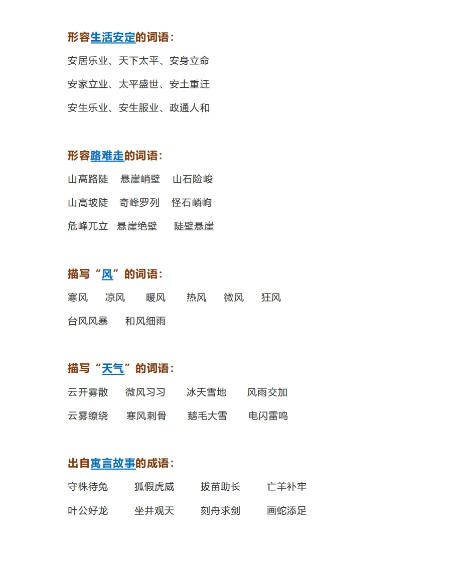 二年级上册语文-重点词语(1)xmtt885个月前发布关注私信0.22MB2页0375 第1页 / 共2页 第2页 / 共2页 已完成全部阅读,共2页 二年级上册语文-重点词语(1)此内容为付费资源,请付费后查看¥1¥2会员服务免费立即购买您当前未登录!建议登陆后购买,可保存购买订单付费资源© 版权声明文章版权归作者所有,未经允许请勿转载。THE END小学小学二年级语文 文本预览 部编版·二年级上册语文重点词语天气的词语:风和日暖春回大地万紫干红春暖花开春风雨露姹紫嫣红春光如海春和景明和风细雨春意盎然万象更新描写动物的词语:活蹦乱跳四蹄生风摇头摆尾万马奔腾龙腾虎跃珍奇异兽千军万马形容天气寒冷的词语:寒冬腊月、大雪纷飞、滴水成冰、天寒地冻冰天雪地、寒风侵肌、寒风刺骨、寒气逼人带“语”或“言”的词语:一言不发、不言不语、三言两语、千言万语窃窃私语、少言寡语、自言自语、甜言蜜语含有数字的成语:五光十色五颜六色九牛二虎四面八方 查看更多 收起部分 喜欢就支持一下吧点赞5 分享QQ空间微博QQ好友海报分享复制链接收藏