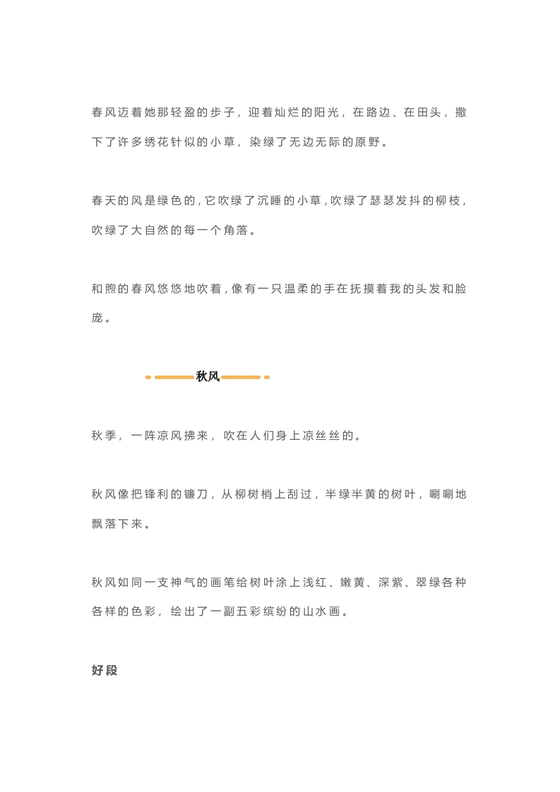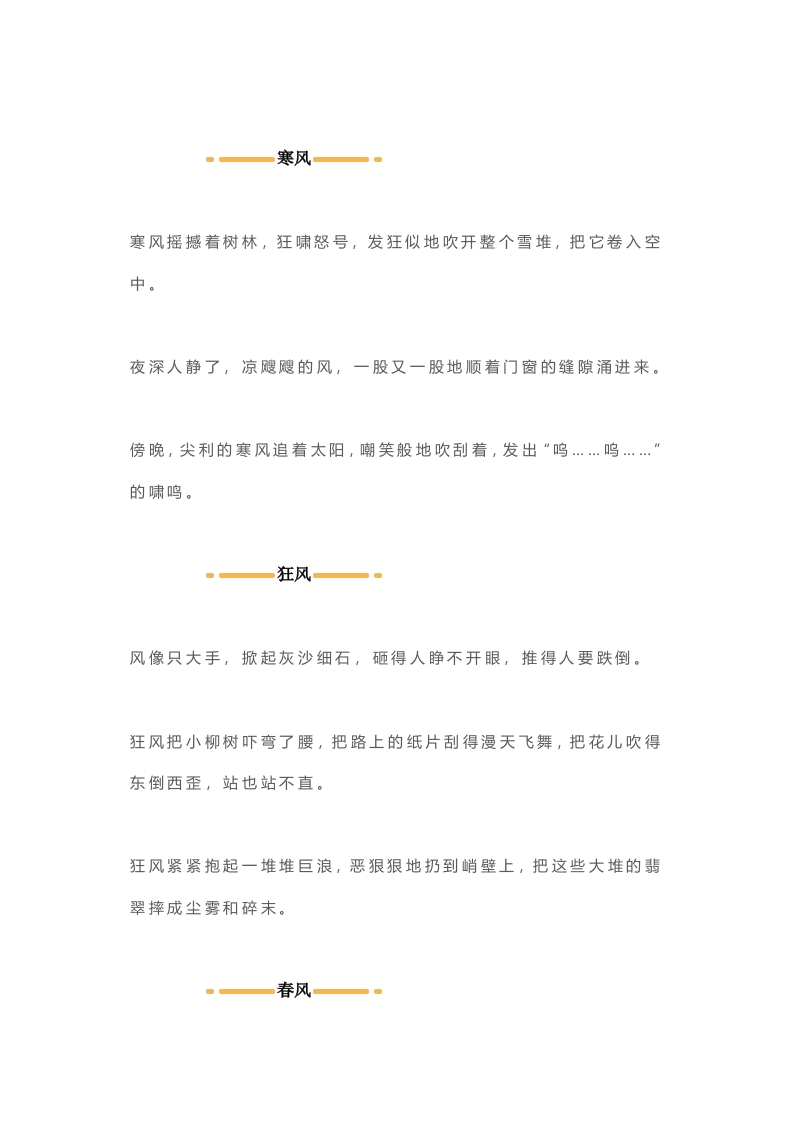 二年级好词好句写作参考好词吹拂、柔和、徐徐、微微、轻轻、阵阵、呼啸、怒吼、咆哮、狂啸、凛冽、清风、疾风、腿风、晨风、寒风、晚风、凉风、夜风瑟瑟习习、和风细雨、春风拂面、微风习习、风吹雨打、风雨交加、秋风萧瑟、狂风肆虐、春风送暖、清风徐徐、凉风习习、斜风细雨、微风低吟、风平浪静微风一。风来了,拂过万物轻轻地来了,好似一股清凉的甘泉沁入人们的心田。微风一吹,隐隐约约、飘飘忽忽梦一般的朦胧,而柳枝随风一摆,又使人感到新生命颤动的欢乐。微风拂过窗栏,轻轻拍动着风铃儿,丁零零地奏出了美妙的旋律。透心清凉的微风,吹走了人们一天的疲倦。