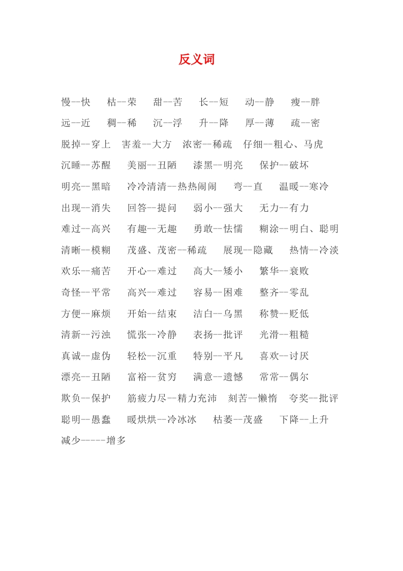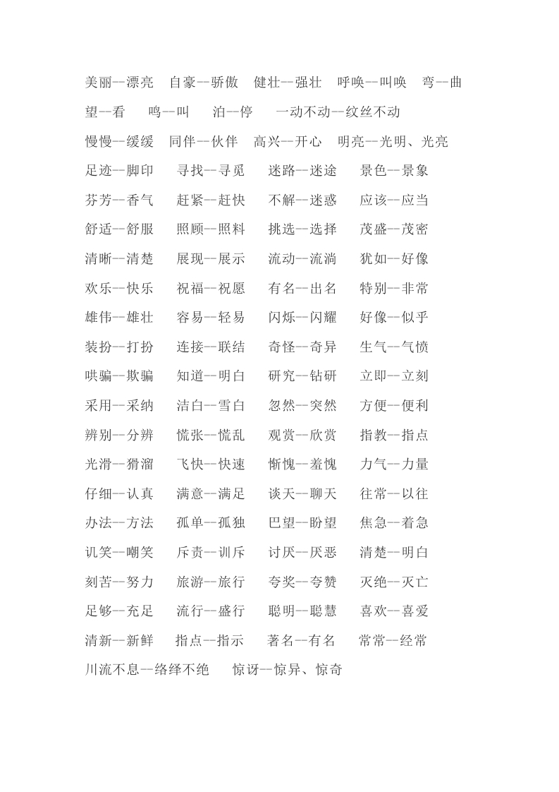二年级语文量词、近反义词、多音字汇总量词一(颗)草莓一(位)同学一(只)蝴蝶一(位)老乡一(篇)文章一(所)小学一(块)黑板一(辆)马车一(道)数学题一(只)天鹅一(件)事情一(把)神斧一(声)巨响一(道)血痕一(只)老虎一(条)帆船一(阵)旋风一(座)石桥一(条)小河一(个)口袋一(头)毛驴一(株)紫丁香一(根)棒一(口)气一(颗)心一(条)山沟一(根)绳一(棵)梨树一(柄)大伞一(片)绿叶一(条)小鱼一(只)蝈蝈一(把)手枪一(位)科学家一(块)石头一(匹)白马一(片)朝霞一(片)茶树一(片)农田一(身)武艺一(群)鱼儿一(片)海洋一(对)翅膀一(个个)水泡一(根)白发一(道道)血痕一(个)哨所一(架)飞机一(艘)潜艇一(枚)导弹一(挺)机枪一(支)步枪一(头)大象一(声)祝福一(件)衬衫一(条)裤子一(间)教室一(扇)窗户一(条)裙子一(个)神话一(面)镜子一(个)村庄一(个)小岛一(个)鸟窝一(种)颜色一(棵)梨树一(只)乌鸦一(次)比赛近义词躲一藏遮一掩脱掉一卸下枯一干追一赶宿一住