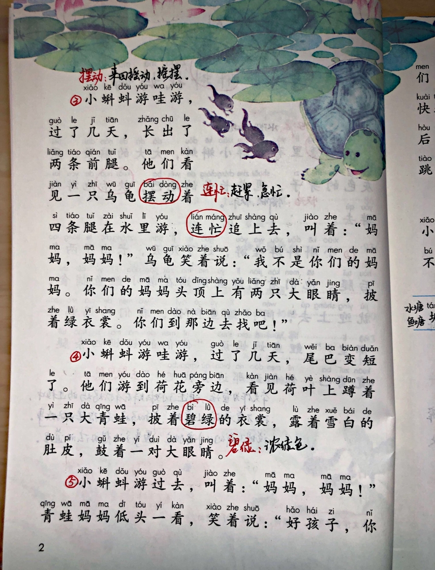 青鞋闲肉孵蛛纳味等成热全夜xiaodou zhaomama1小目蝌蚪找妈妈泗唱:水泡,水坑.chi tangyou yi qun xiao kēdǒudada de nao daihei池塘里有一群小蝌蚪,大大的脑袋,黑sede shen zishuai zhe changchang de wei bakuai huode youi灰色的身子,甩着长长的尾巴快活地游来86快洛:愉快,快娩。89舞去093xiao kēdou you wa youguòle ji tianzhang chu le liang tiao®小蝌蚪游哇游,过了几天,长出了两条hou tuita men kan jian li yu mama zai jiao xiao l yubu shi后腿。他们看见鲤鱼妈妈在教小鲤鱼捕食,97ying shang quwenyāyiwo men demama zài00就迎上去,问:“鲤鱼阿姨,我们的妈妈在03nyu mama shuo ni men de mama si tiao tui06哪里?”鲤鱼妈妈说:“你们的妈妈四条腿,kubani men dao na bian qu zhao ba109宽嘴巴。你们到那边去找吧!”主题思想:车作为童治,讲述了小购好东状好妈的过移中阳不觉项花小青蛙,并和妈妈起捉收事说3和“小安独立、曼等冲想熟法的翻.2619本文作者方惠珍、盛璐德,选作课文时有改动。