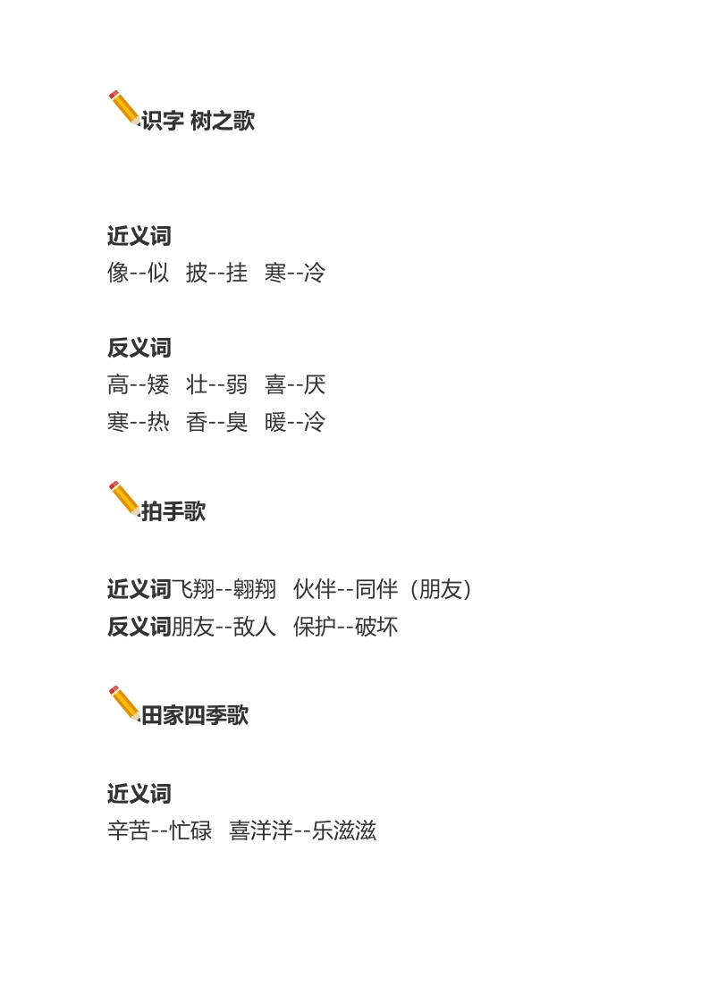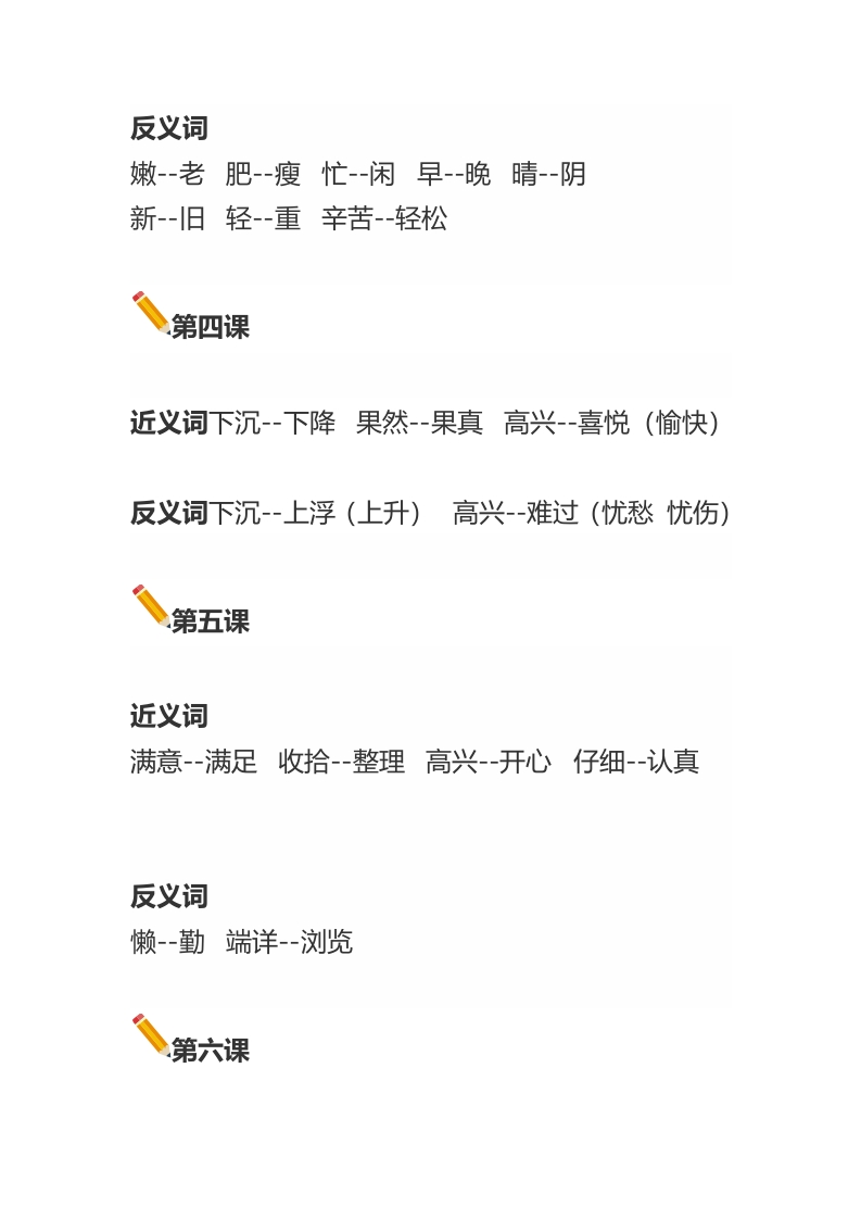 语文二年级上册近义词反义词汇总大全(1)xmtt885个月前发布关注私信61.41KB11页0407 第1页 / 共11页 第2页 / 共11页 第3页 / 共11页 试读已结束,还剩8页,您可下载完整版后进行离线阅读 语文二年级上册近义词反义词汇总大全(1)此内容为付费资源,请付费后查看¥1¥2会员服务免费立即购买您当前未登录!建议登陆后购买,可保存购买订单付费资源© 版权声明文章版权归作者所有,未经允许请勿转载。THE END小学小学二年级语文 文本预览 统编语文二年级(上)全册近义词+反义词第一课近义词宽-广连忙-赶忙(赶快、马上)反义词长-短快活-难过第二课近义词平常-平时温和-温顺办法-方法反义词低-高升-降温和-暴躁许多-少许第三课近义词如果-假如告别-告辞旅行-旅游反义词轻-重好-坏细心-粗心仔细-马虎 查看更多 收起部分 喜欢就支持一下吧点赞7 分享QQ空间微博QQ好友海报分享复制链接收藏