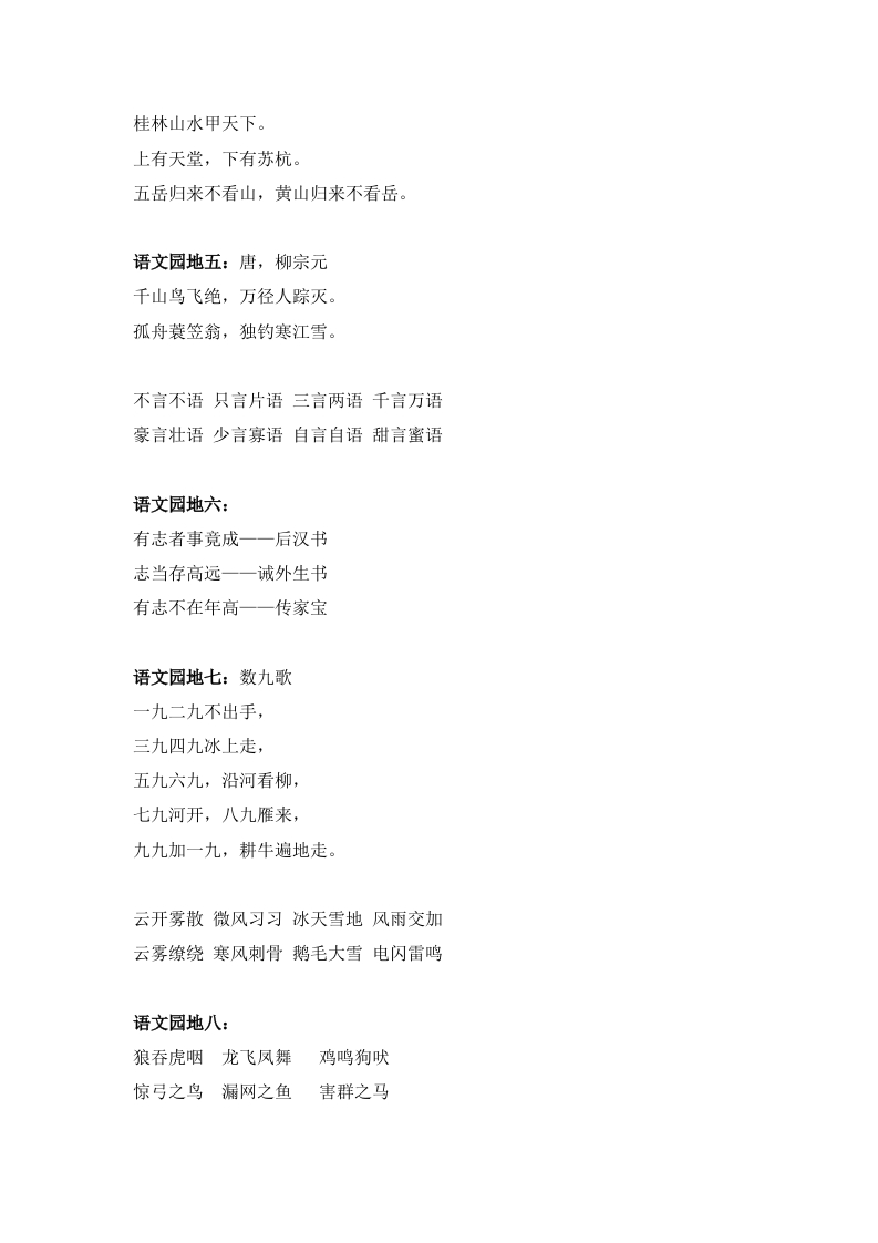 部编教二年级语文上册日积月累语文园地一:梅花,宋,王安石墙角数枝梅,凌寒独自开,遥知不是雪,唯有暗香来。语文园地二:有山皆图画,无水不文章。一畦春韭绿,十里稻花香。忠厚传家久,诗书继世长。十二月花名歌正月山茶满盆开,二月迎春初开放。三月桃花红十里,四月牡丹国色香。五月石榴红似火,六月荷花满池塘。七月茉莉花如雪,八月桂花满枝香,九月菊花姿百态,十月芙蓉正上妆。冬月水仙案头供,腊月寒梅斗冰霜。语文园地三:小儿垂钓,唐,胡令能蓬头稚子学垂纶,侧坐莓苔草映身。路人借问遥招手,怕得鱼惊不应人。含苞欲放百花争艳花红柳绿春色满园书籍是人类进步的阶梯一一高尔基语文园地四:白色一一雪白米白奶白红色一一火红桃红枣红黄色一一土黄鹅黄金黄绿色一一草绿翠绿墨绿