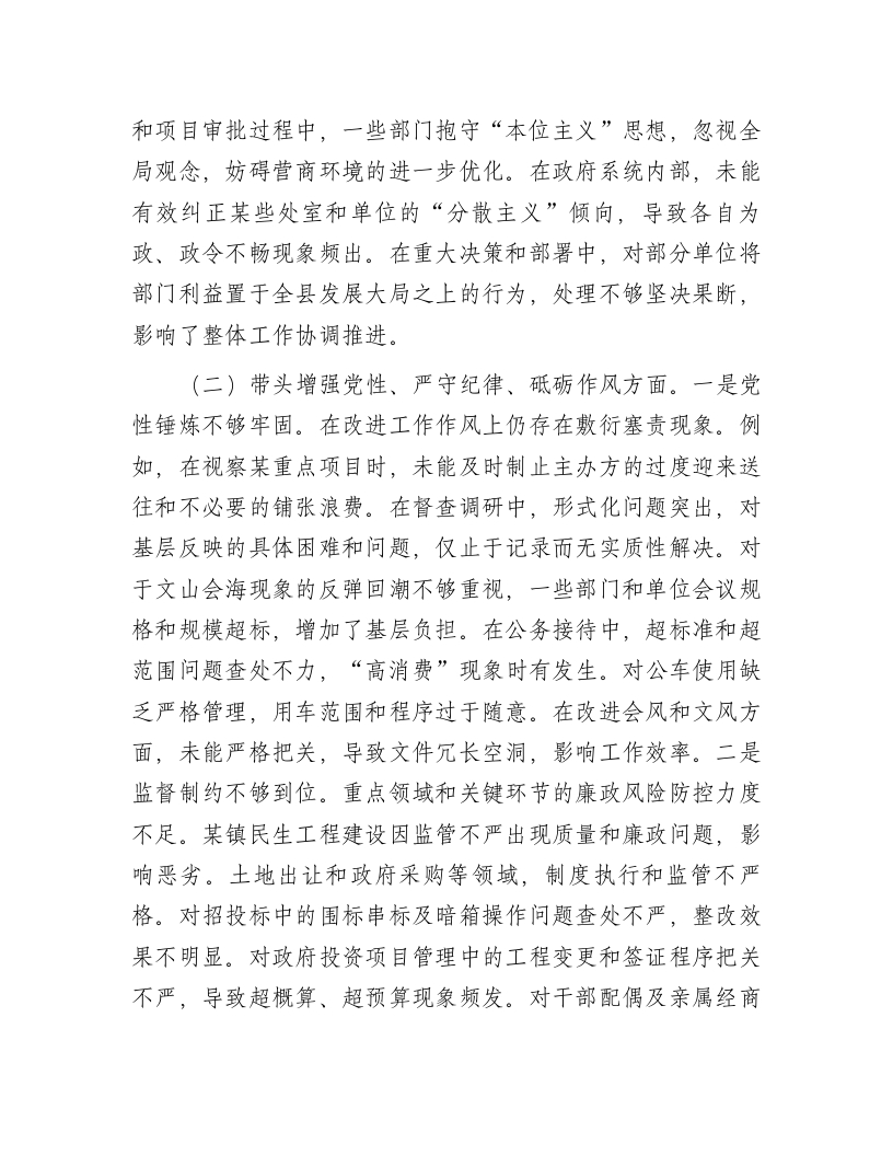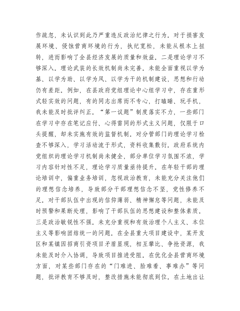 县领导2024年度民主生活会个人对照检查材料按照关于开好2024年度党员领导干部民主生活会安排部署,本人紧扣“深入学习贯彻习近平新时代中国特色社会主义思想,巩固深化党纪学习教育成果,综合发挥党的纪律教育约束、保障激励作用,为进一步全面深化改革、推进中国式现代化提供坚强纪律保证”主题,结合分管工作和个人实际,深入查找问题,认真进行对照检查。现将个人对照检查情况汇报如下:一、存在的主要问题(一)带头严守政治纪律和政治规矩方面。一是对政治纪律理解不够透彻。未能充分意识到政治纪律在团结统一中的关键作用,误将其简化为普通的工作纪律。在全县经济工作会议上,对部分部门和乡镇存在的“弄虚作假”、“隐瞒事实”行为,仅停留在工作层面进行批评,而未从政治纪律的高度严肃对待。去年安全生产大检查期间,某化工园区企业对于重大风险隐患的整治未能有效推进,本应站在政治高度积极推进整改,但我未能及时介入督导,直至省级督查通报后方才重视。在推动乡村振兴的过程中,对部分乡镇“形式主义”、“表面文章”现象缺乏政治纪律的严肃性处理,反而误认为是基层干部的积极表现。在改善营商环境的过程中,对某些部门的“数字游戏”、“虚假数据”问题未予足够重视,仅视其为一般工