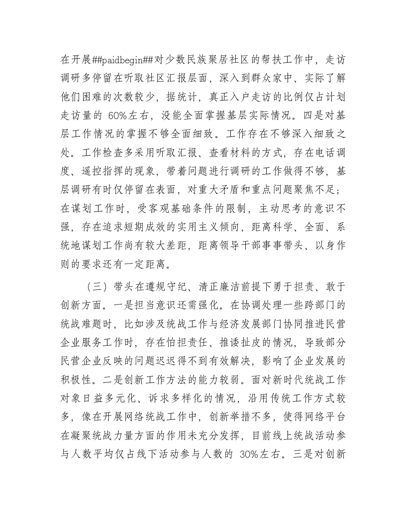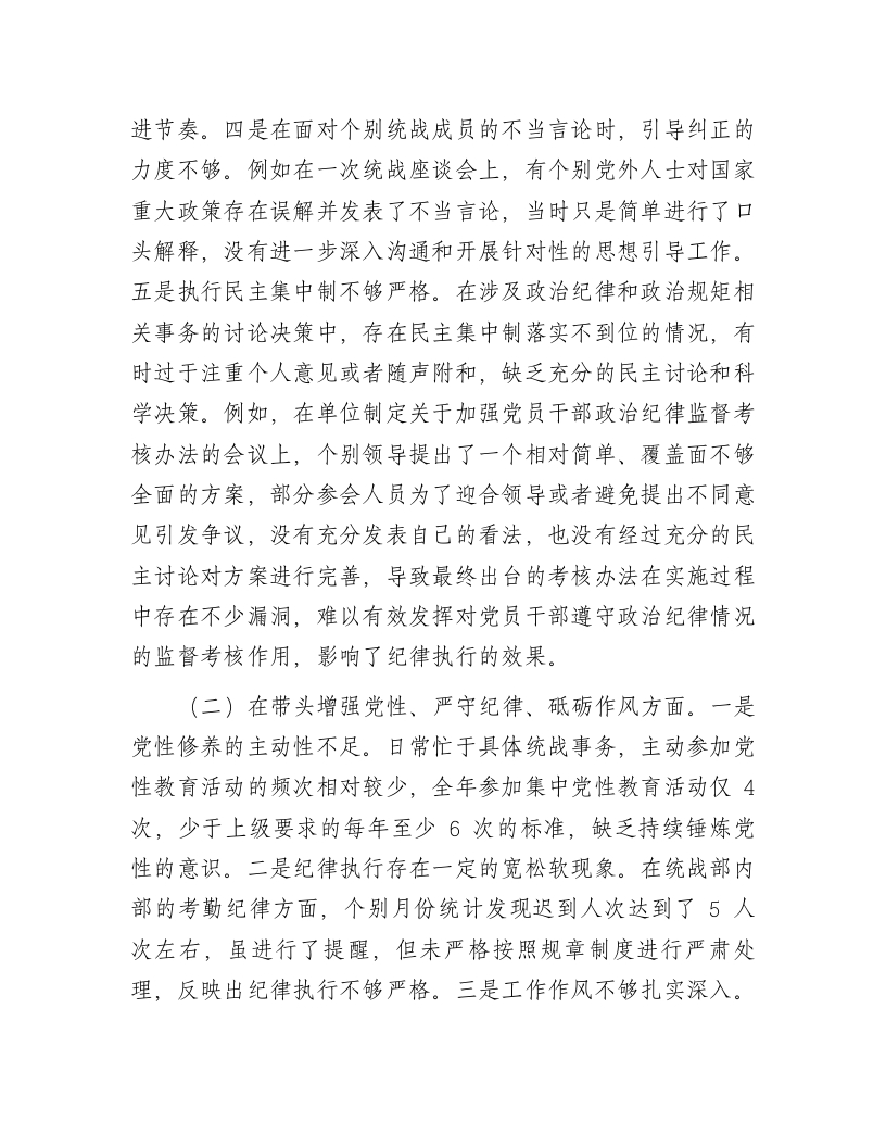 市委统战部部长2024年度专题民主生活会、组织生活会对照检查材料(四个带头)根据市委《关于召开2024年度民主生活会的通知》有关要求和部党组相关工作部署,我紧紧围绕本次民主生活会主题,结合自身实际情况,认真对照“四个带头”,全面深入查摆了自身存在的突出问题,认真分析了问题产生的原因,逐项明确了下一步整改措施。按照会议安排,现将个人对照检查情况汇报如下。一、存在的主要问题(一)在带头严守政治纪律和政治规矩,维护党的团结统一方面。一是政治理论学习深度还不够。在学习习近平总书记关于统一战线工作的重要论述时,存在一知半解、浅尝辄止的情况,比如在组织统战部内部学习活动中,部分同志对一些重要论断未能准确把握其内涵,通过后续的知识测试发现,准确率仅有70%左右,反映出在学习引导上还不够扎实。二是知行合一还有差距。在知晓政治纪律和政治规矩的具体内容后,在实际工作和生活中转化为自觉行动的能力还有待提高,学用脱节情况依然存在。三是落实上级决策部署的时效性有待提高。在推进一些统战领域的政策落地时,如关于新的社会阶层人士统战工作的相关部署,本应在一个月内完成初步的调研反馈工作,但实际却延迟了一周左右,影响了后续工作的整体推